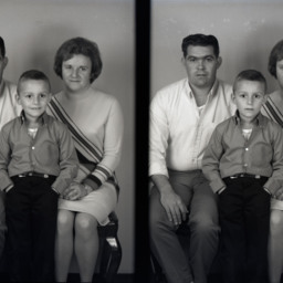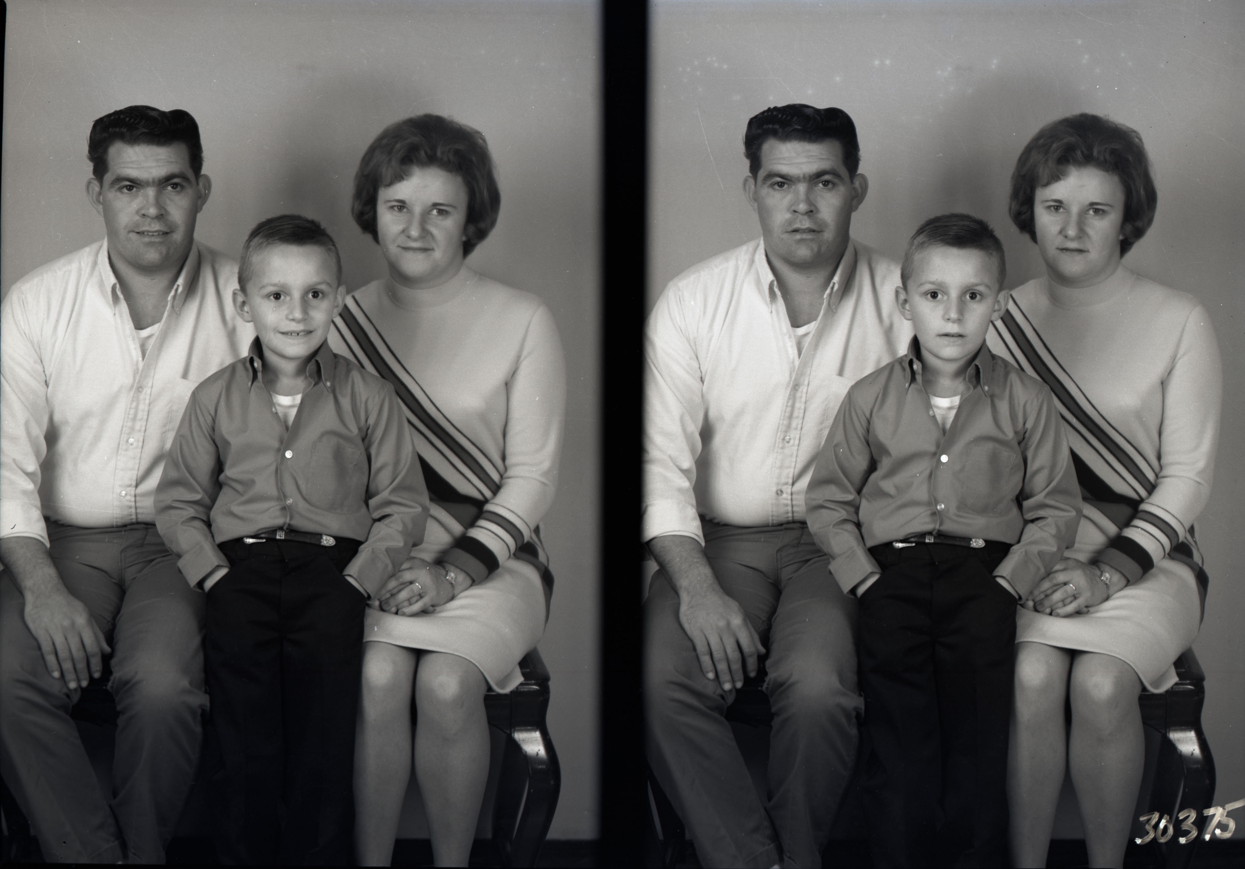 Photo of two separate photographs of an unidentified man, woman and young boy seated together.