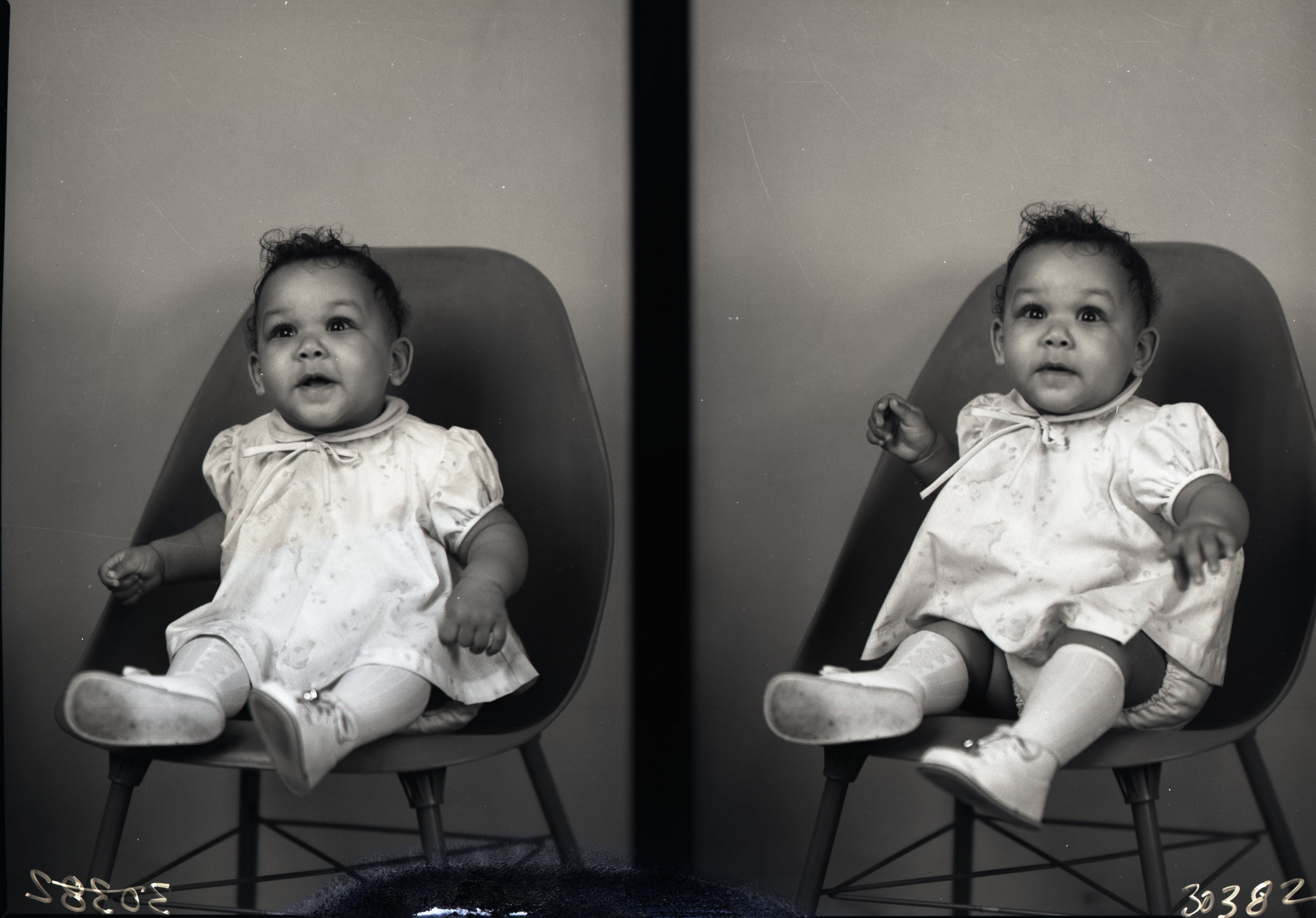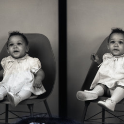 Photo of two separate photographs of the same unidentified young child propped on a chair.