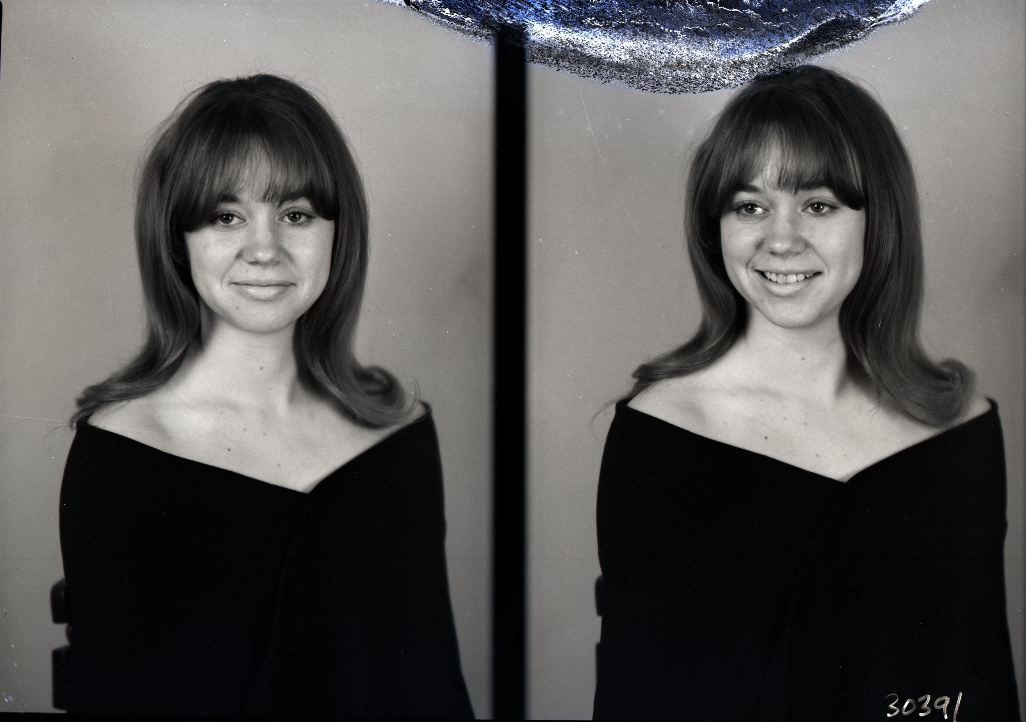 Photo of two separate portrait photographs of Phyllis (Funkhouser) Sine as a young woman with long hair and bangs.
