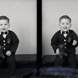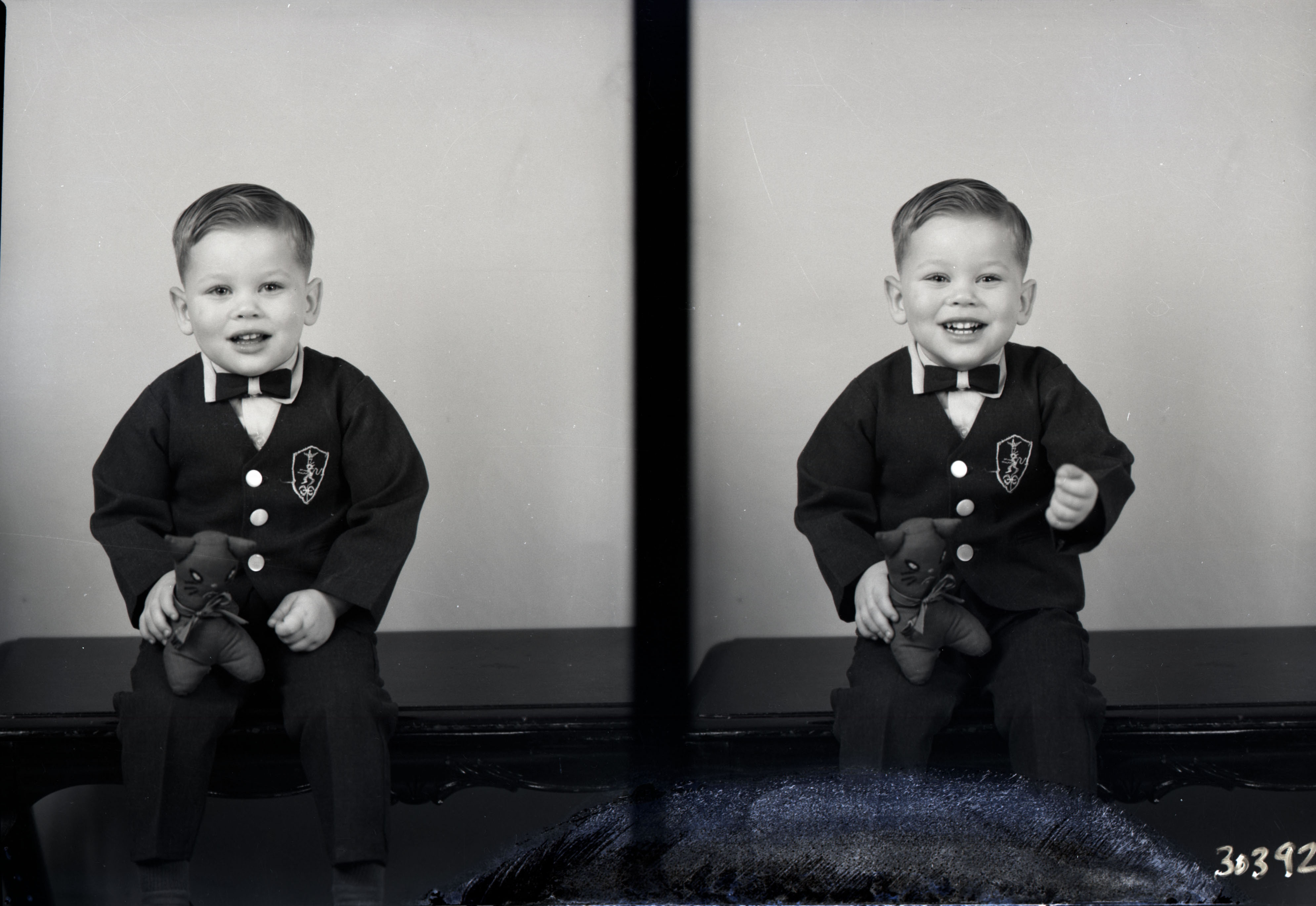 Photo of two separate photographs of an unidentified young boy wearing a bow tie and holding a stuffed toy on his knee.