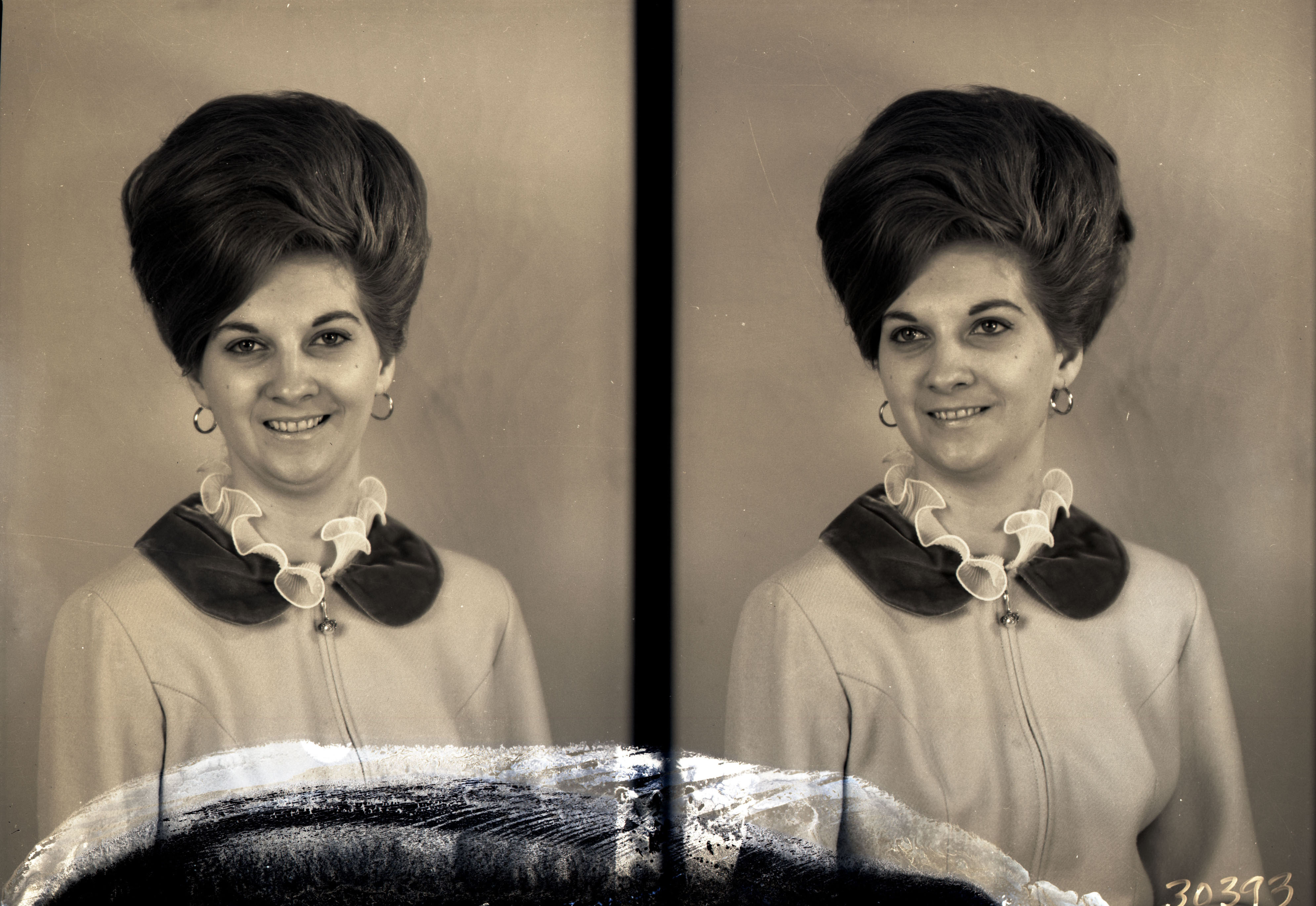 Photo of two separate portrait photographs of the same unidentified woman with her hair styled up and wearing hoop earrings with her outfit.