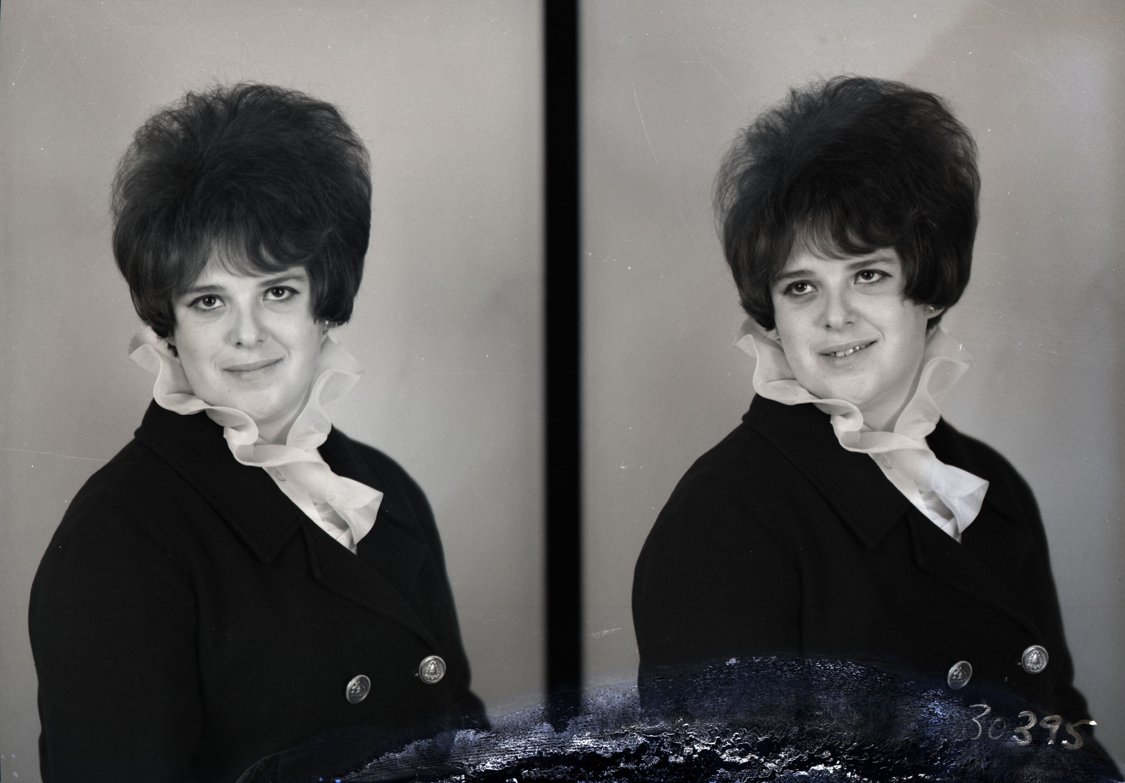 Photo of two separate portrait photographs of Peggy Evy as a young woman with short hair.