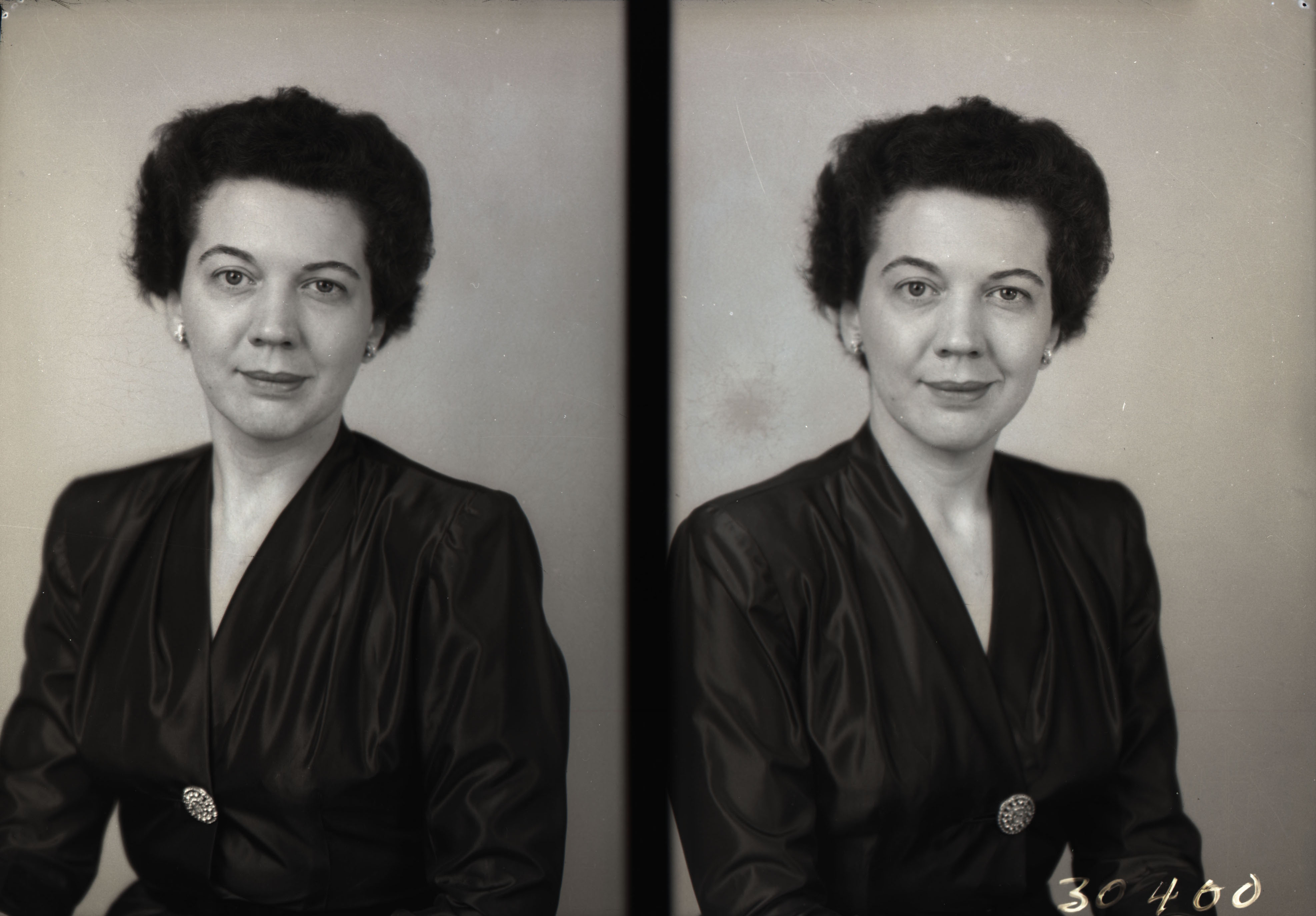 Photo of two separate portrait photographs of the same unidentified woman with short styled hair and earrings.
