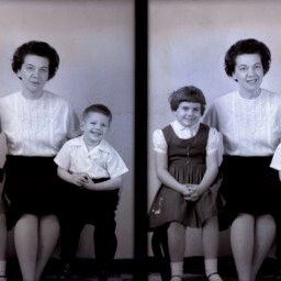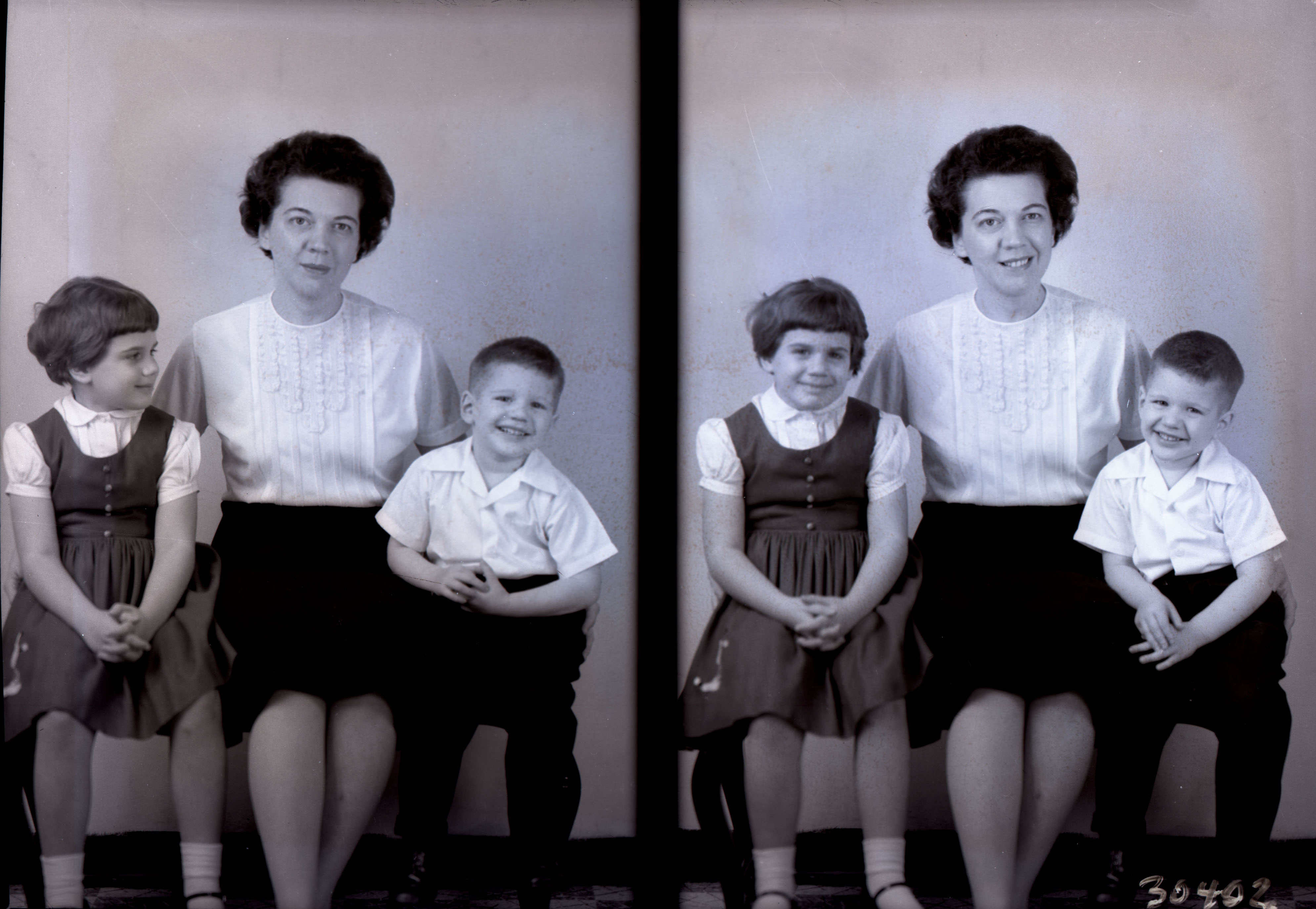 Photo of two separate photographs of an unidentified woman in a skirt and blouse, seated, with an unidentified child seated on either side of her.