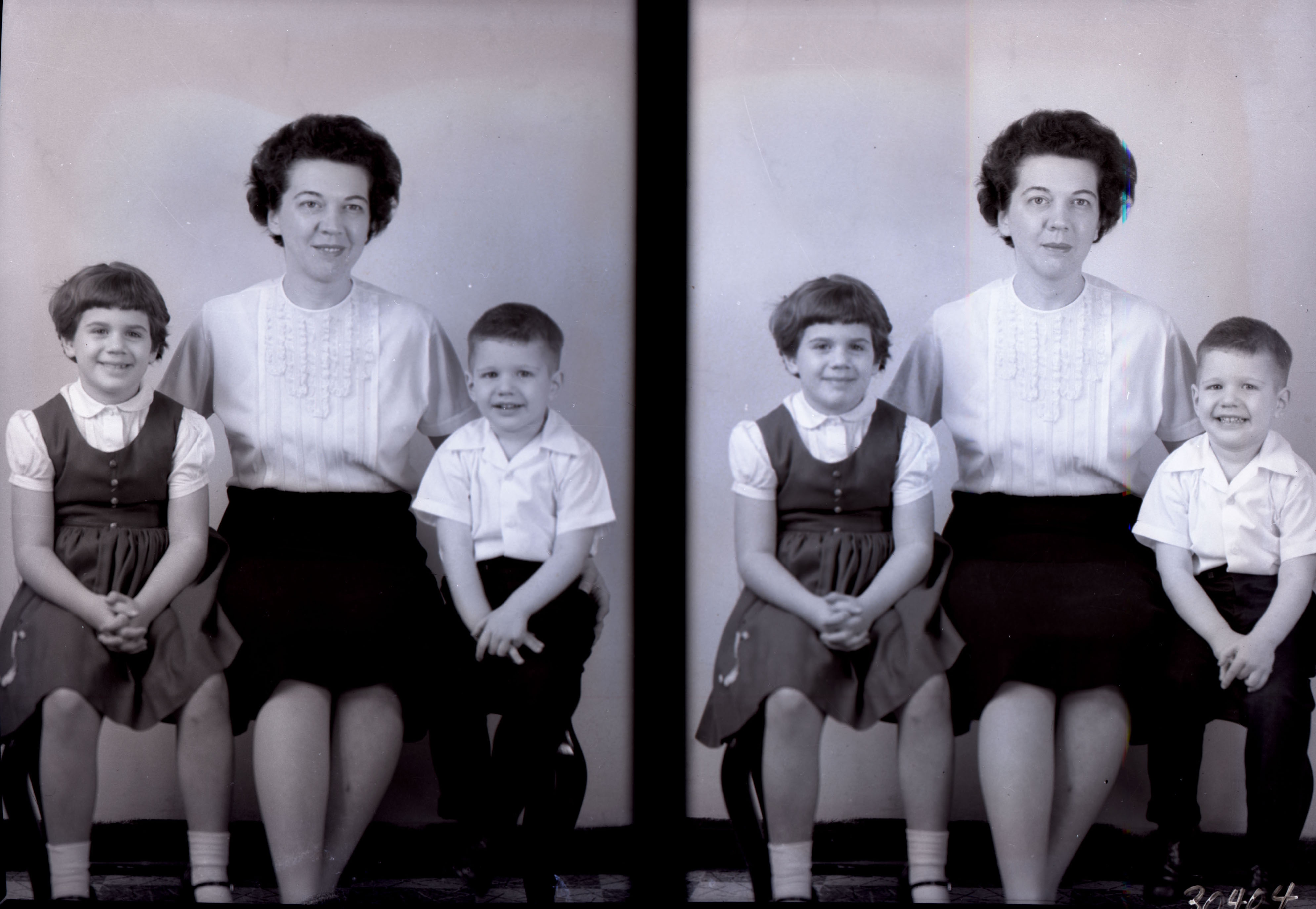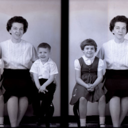 Photo of two separate photographs of an unidentified woman in a skirt and blouse, seated, with an unidentified child seated on either side of her.