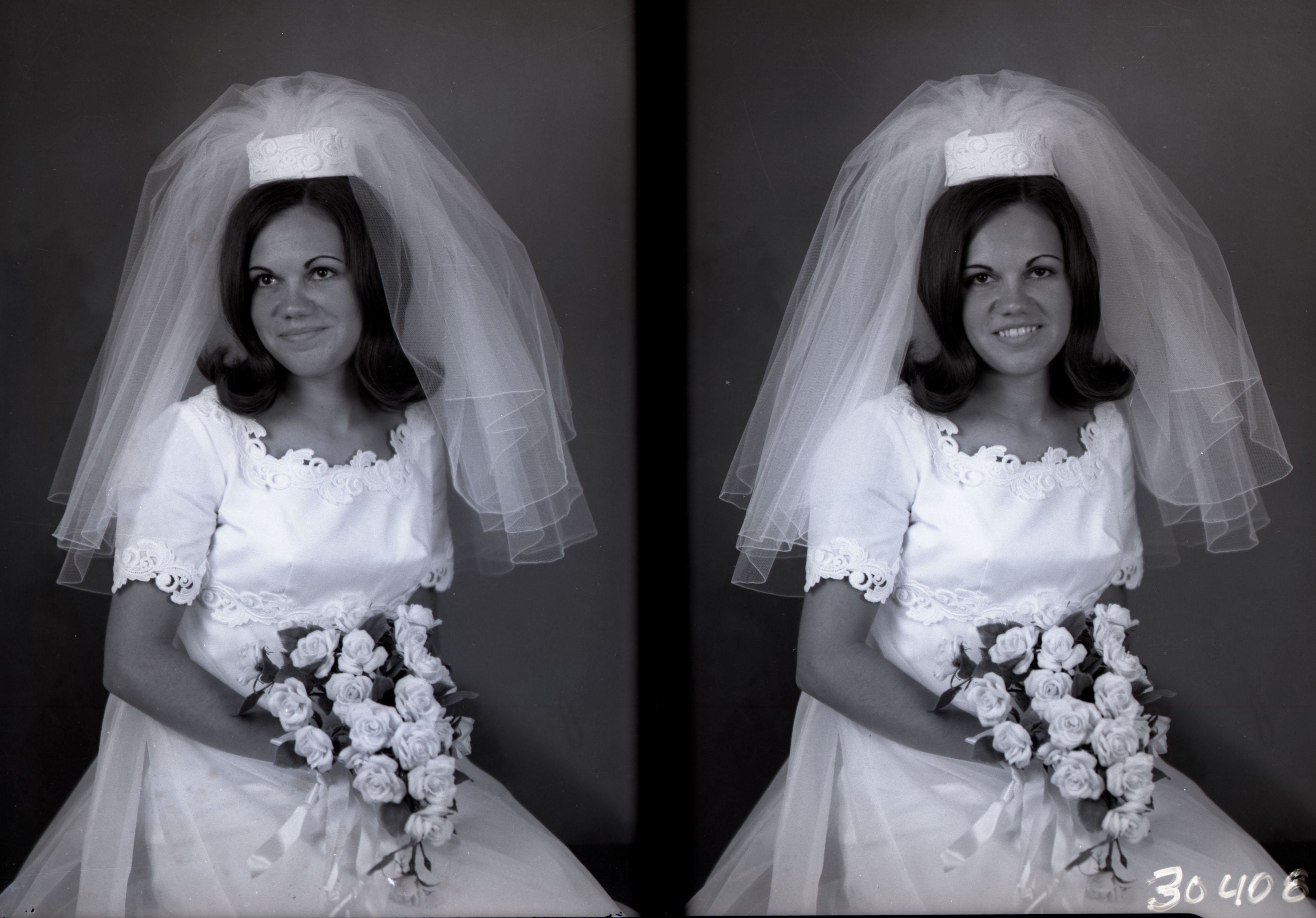 Photo of two separate photographs of an unidentified bride wearing her wedding gown, veil, and bouquet.