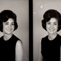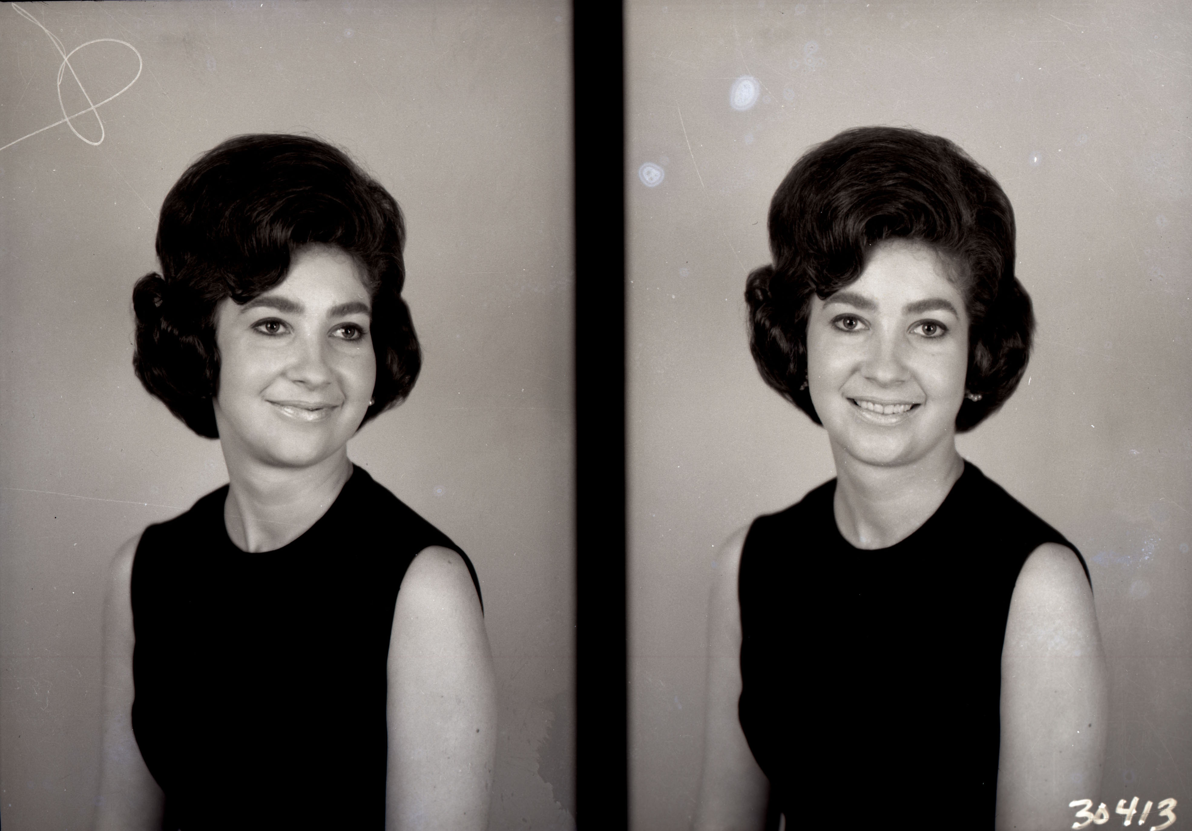 Photo of two separate portrait photographs of the same unidentified woman with short, styled hair.