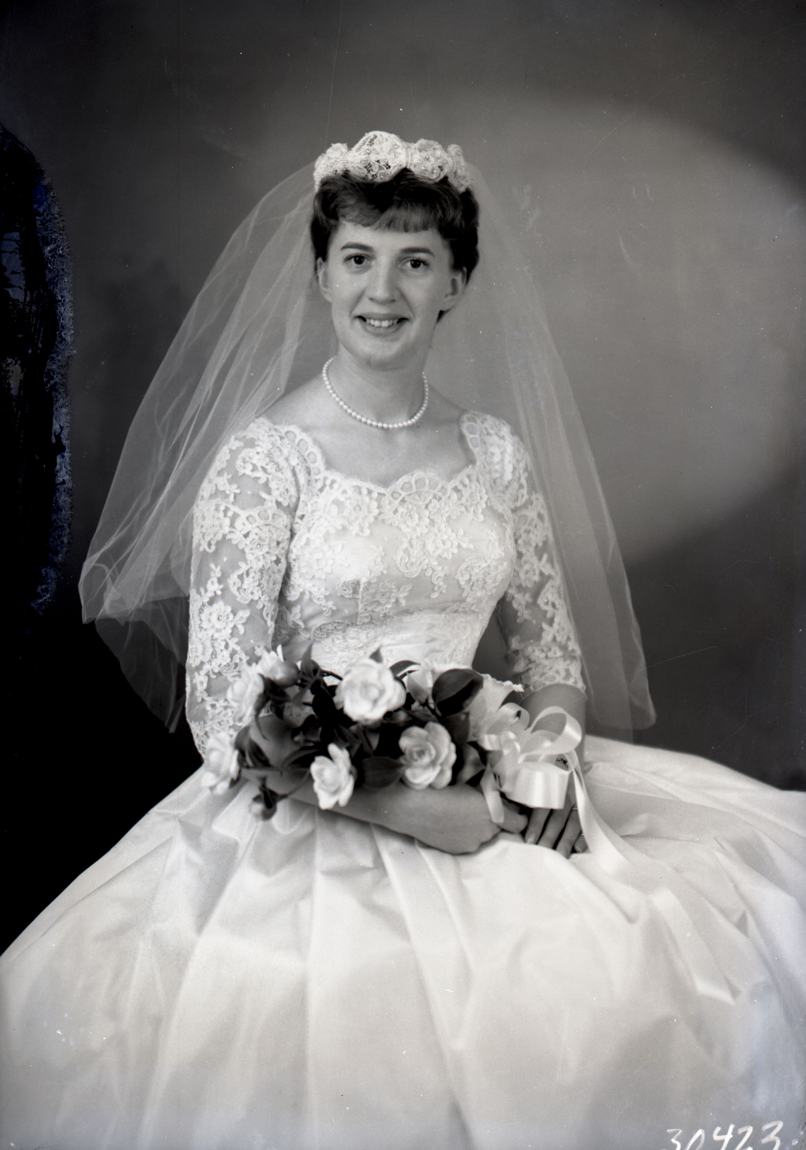 Unidentified young bride is seated in her wedding gown, veil and bouquet. She is wearing a pearl necklace.