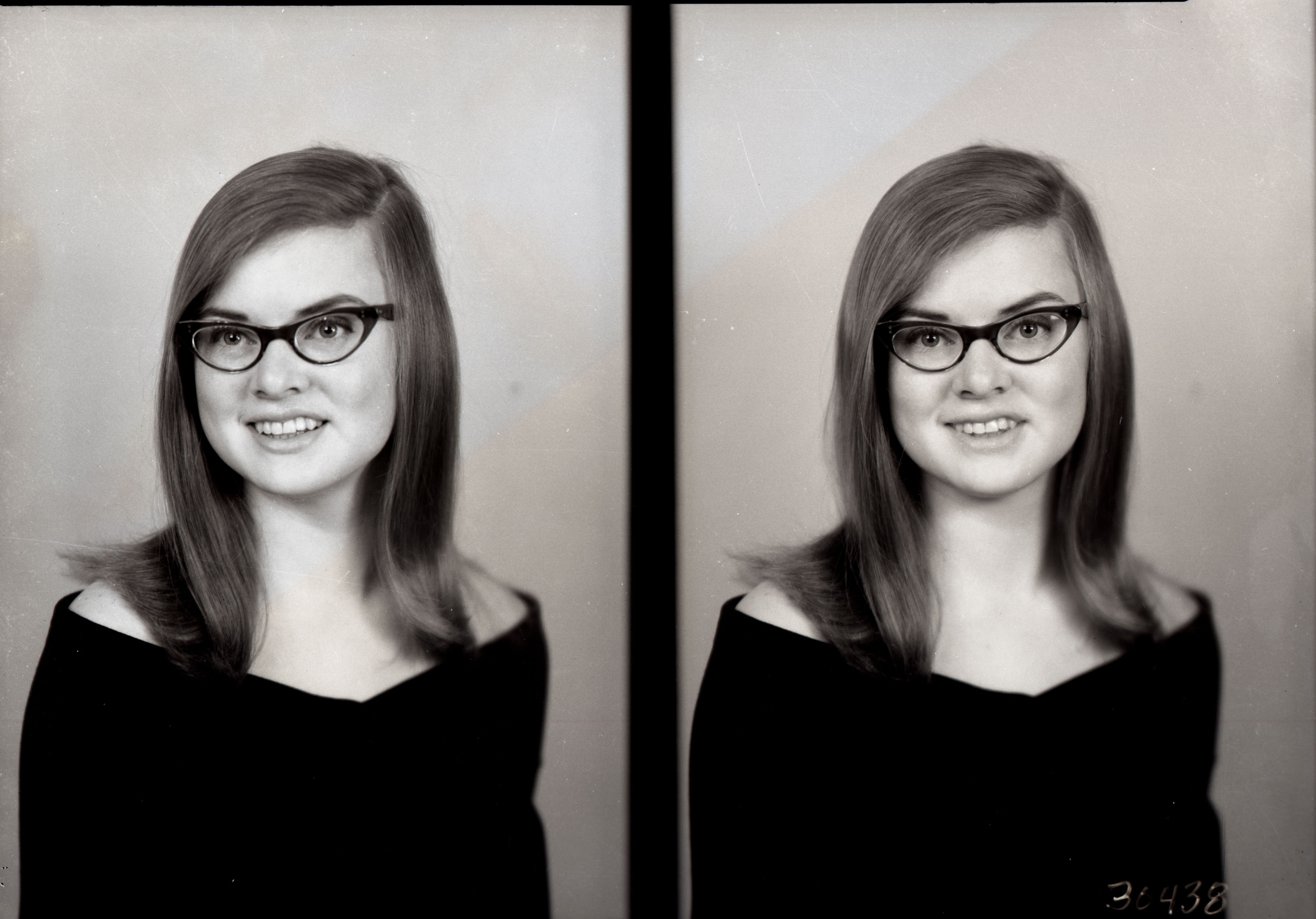 Photo of two separate portrait photographs of Sandra Kay (Wolverton) White as a young woman with straight hair and glasses.