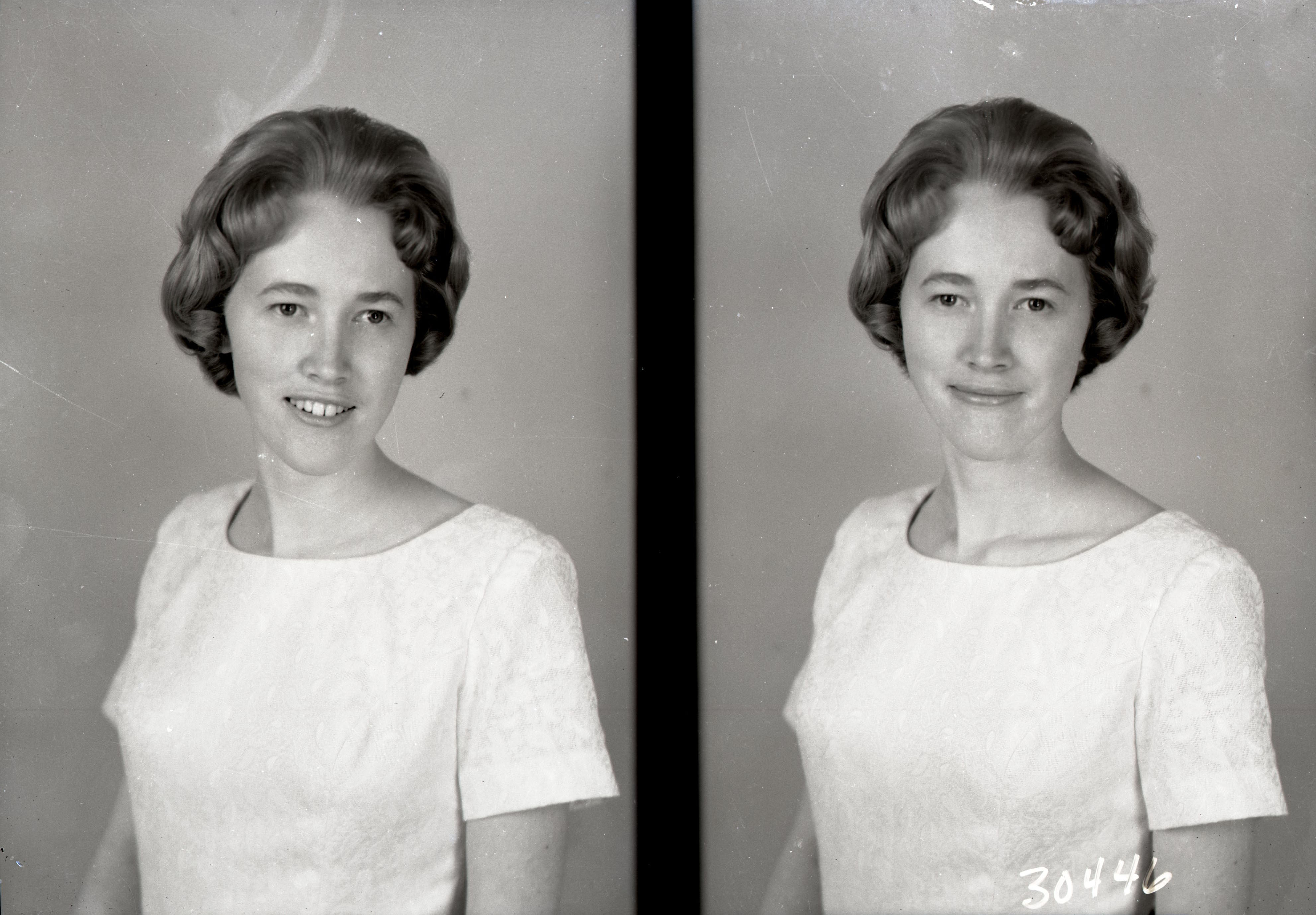 Photo of two separate portrait photographs of Carolyn Faye (Tusing) Jennings as a young woman with short, styled hair.