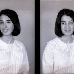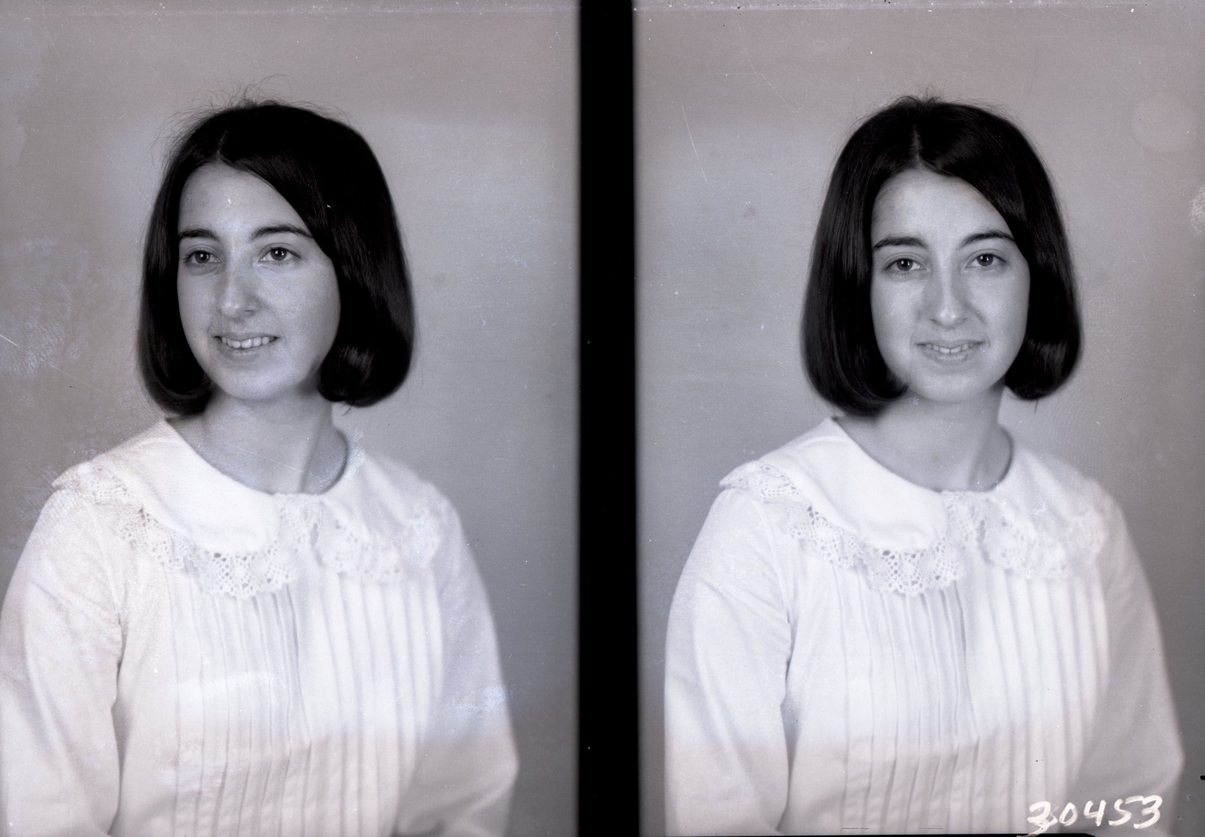 Photo of two separate portrait photographs of an unidentified young woman with short hair.