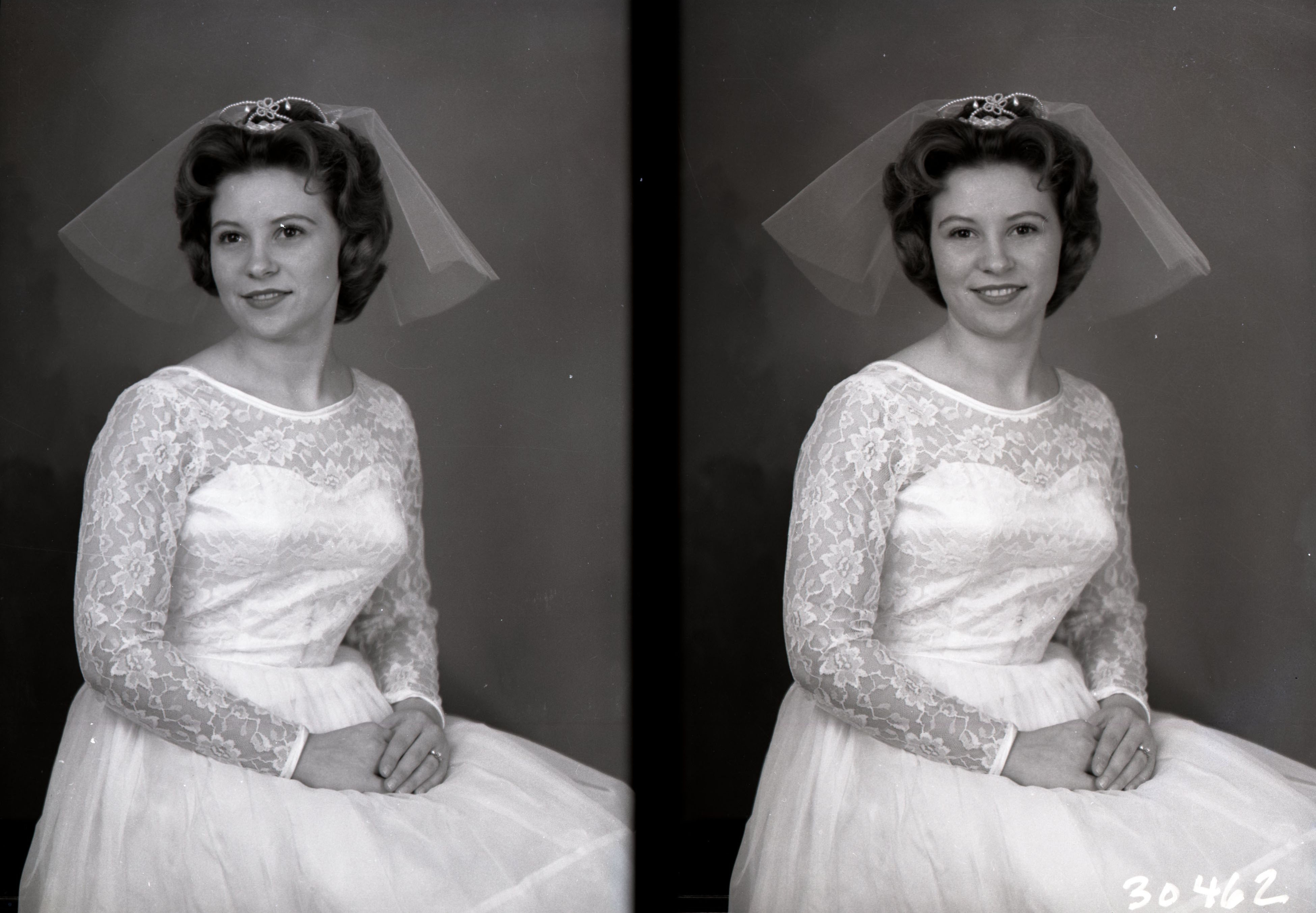 Photo of two separate photographs of an unidentified young bride posed in her wedding gown and short veil.