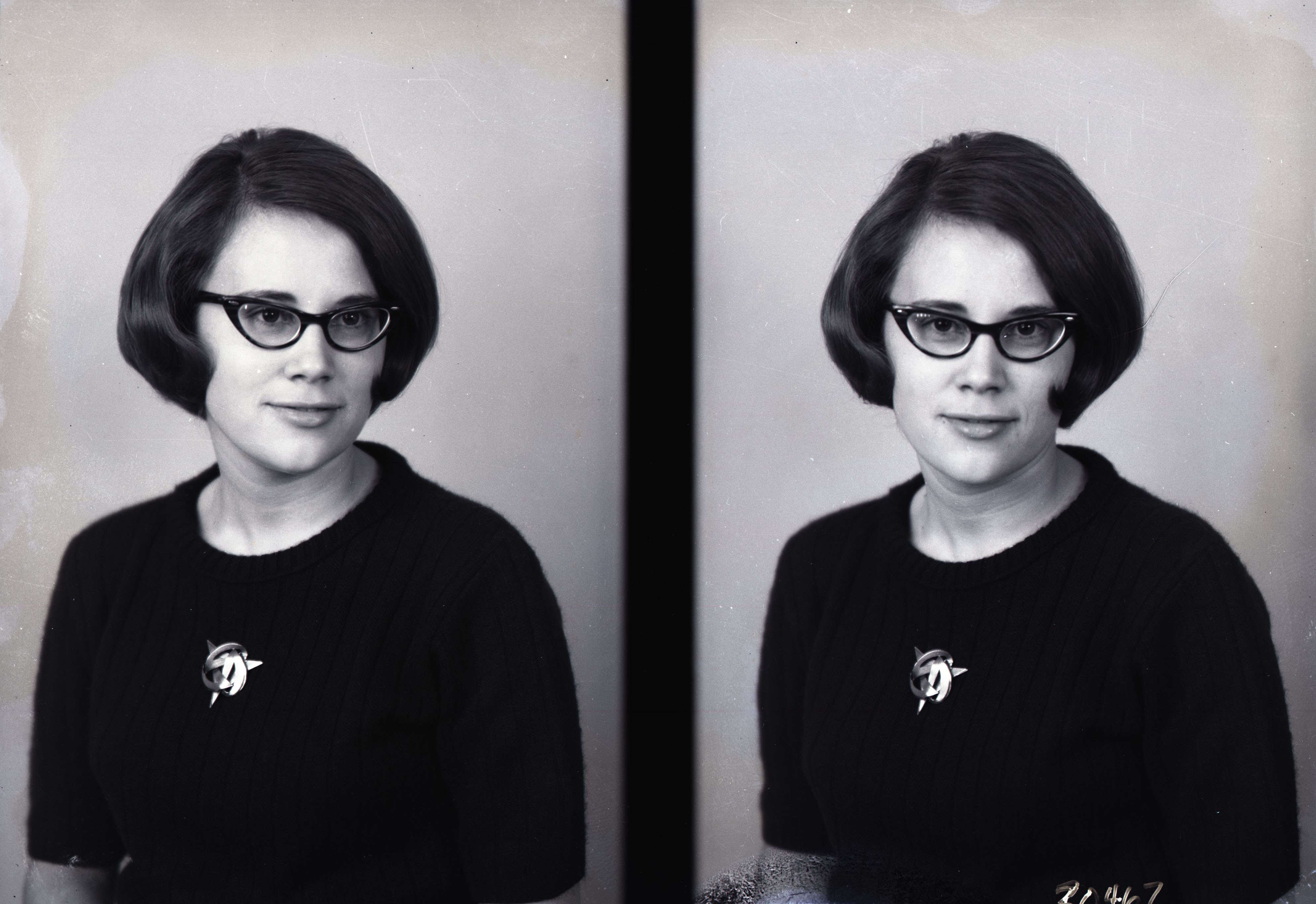 Photo of two separate portrait photographs of Nancy (Bowman) Silvious as a young woman with short hair, glasses and wearing a pin on the front of her short-sleeved dress.