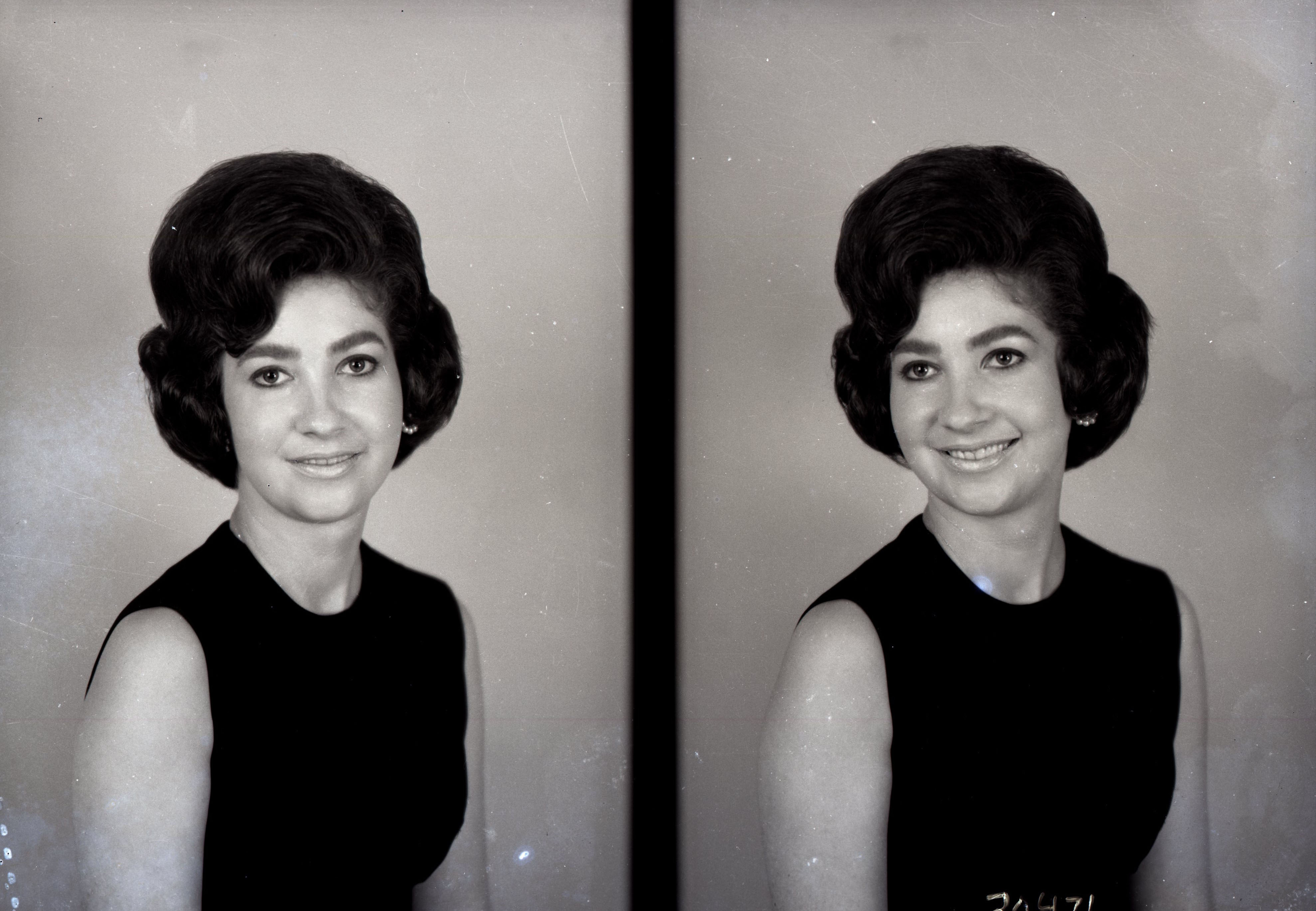 Photo of two separate portrait photographs of the same unidentified woman with short, styled hair and wearing a sleeveless top.