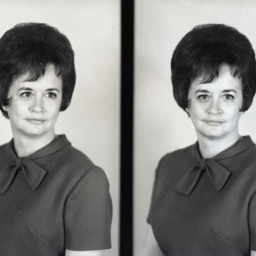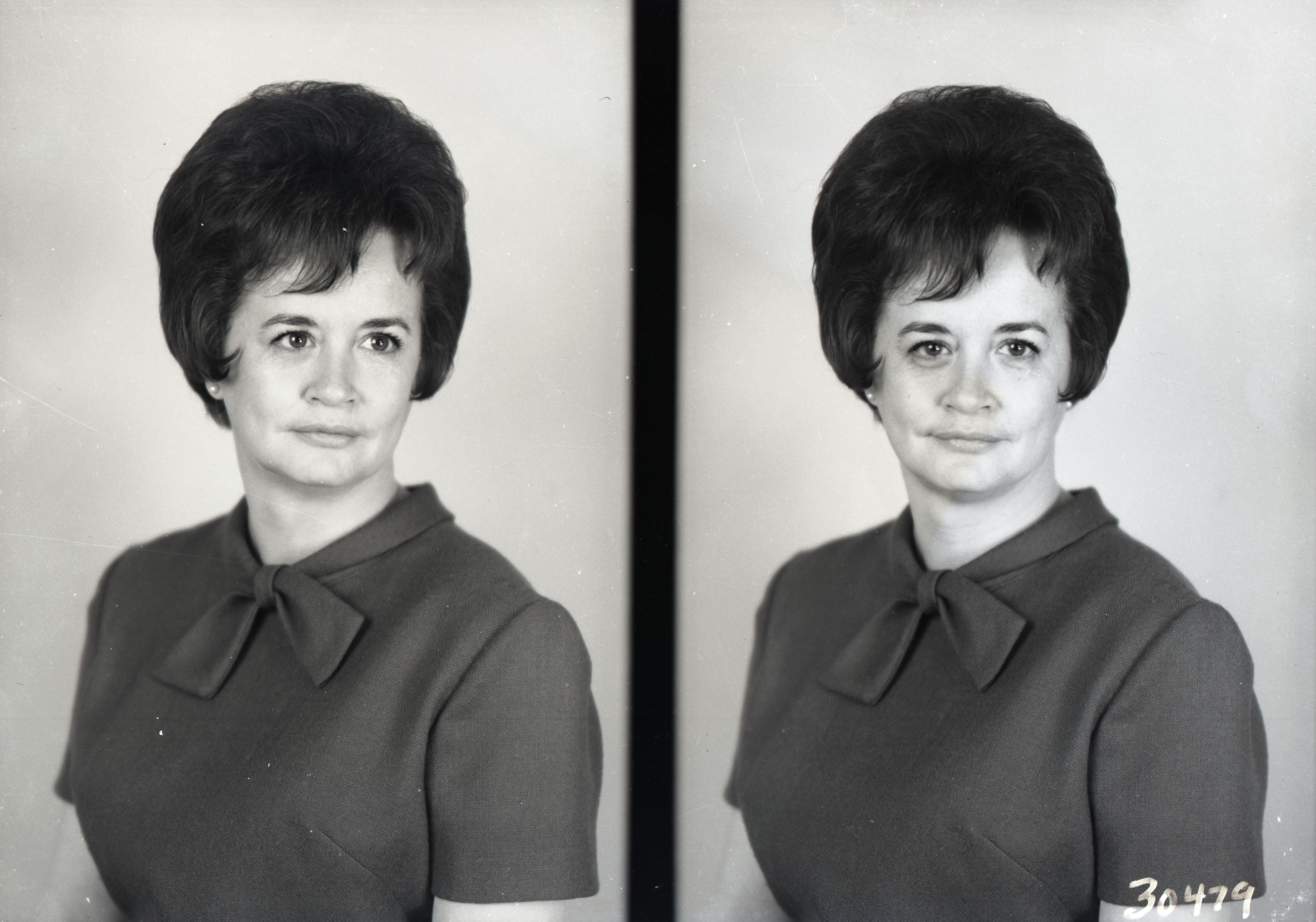 Photo of two separate portrait photographs of Margaret Hollar with short, styled hair and a bow on her dress.