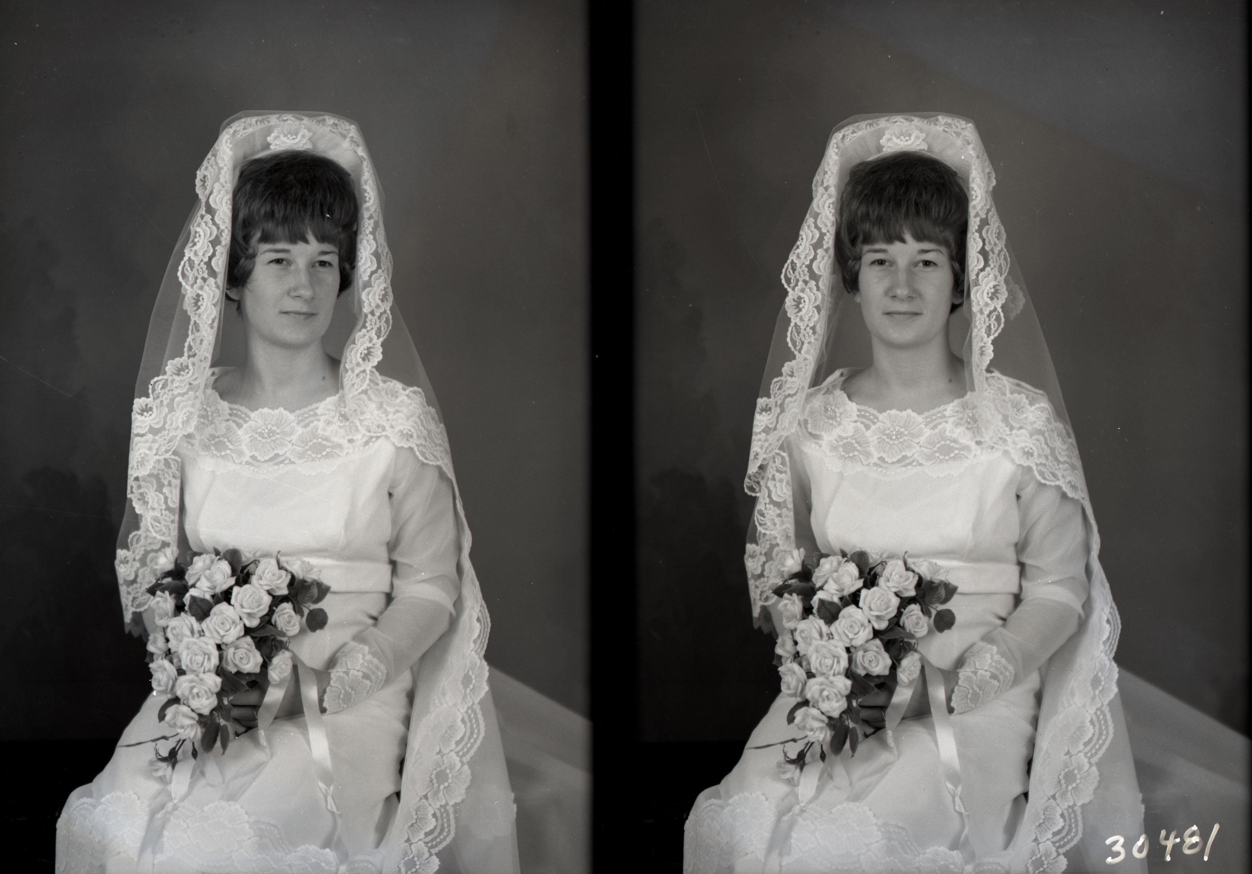 Photo of two separate photographs of an unidentified bride in her wedding gown, veil and bouquet.