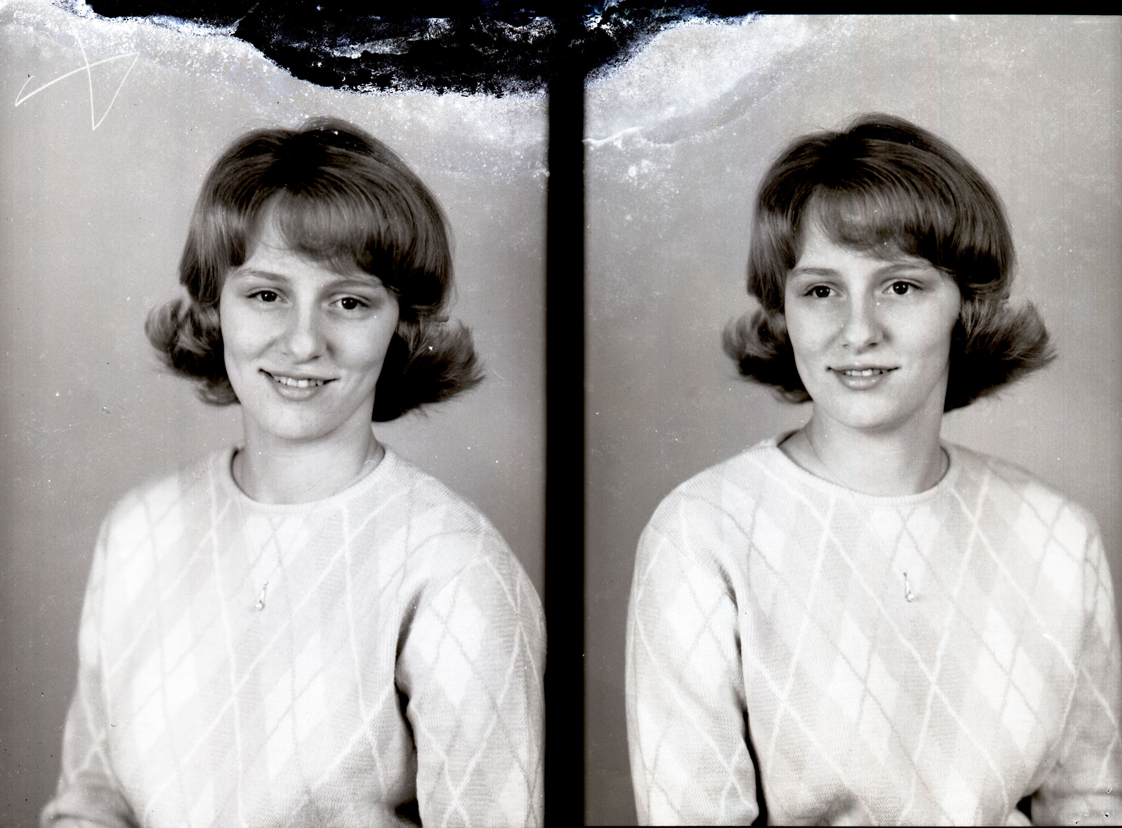 Photo of two separate portrait photographs of Gretchen Rebecca Benchoff as a young woman with short hair and bangs.