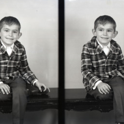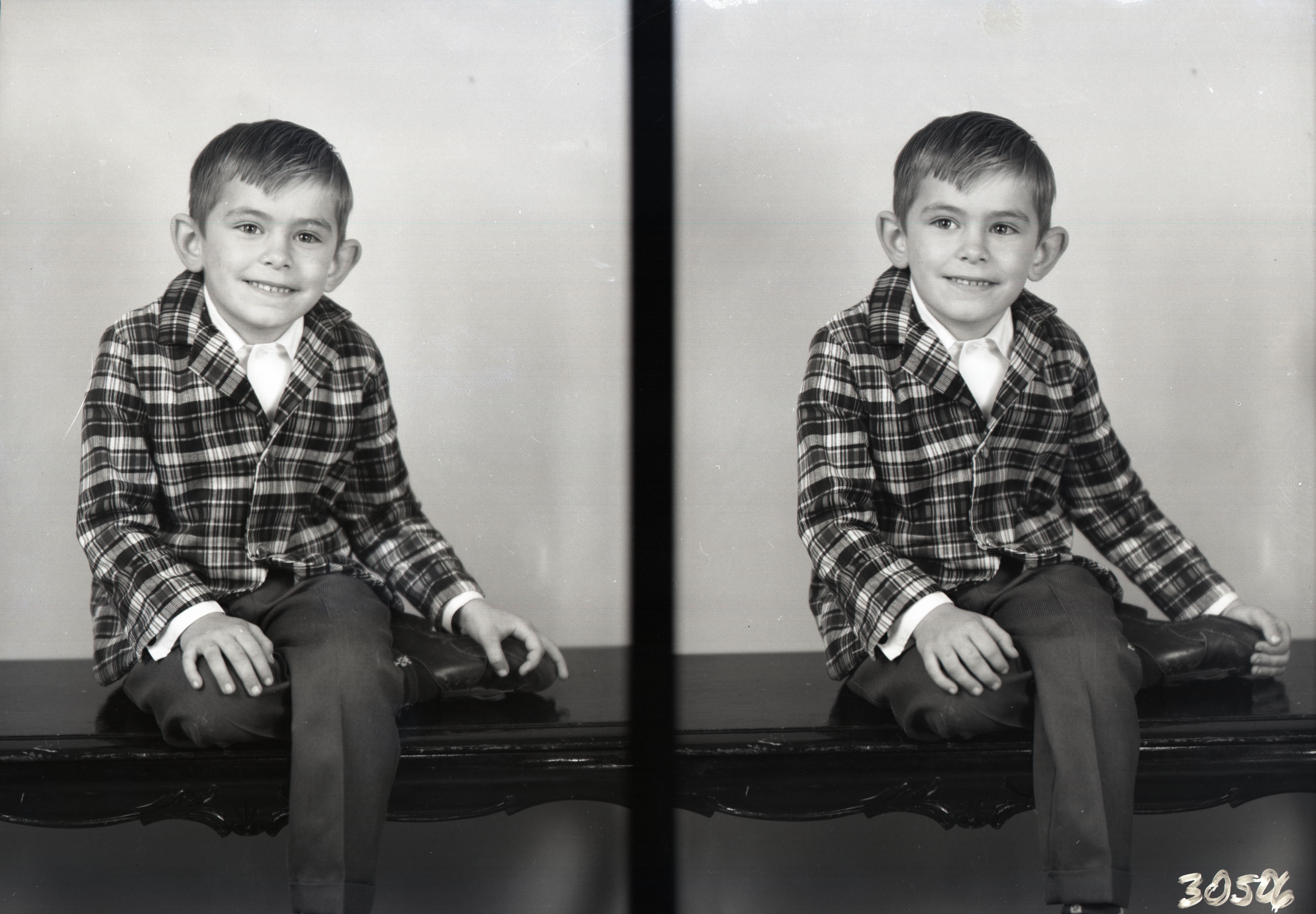 Photo of two separate photographs of the same unidentified boy in a plaid jacket and seated with one leg under the other.