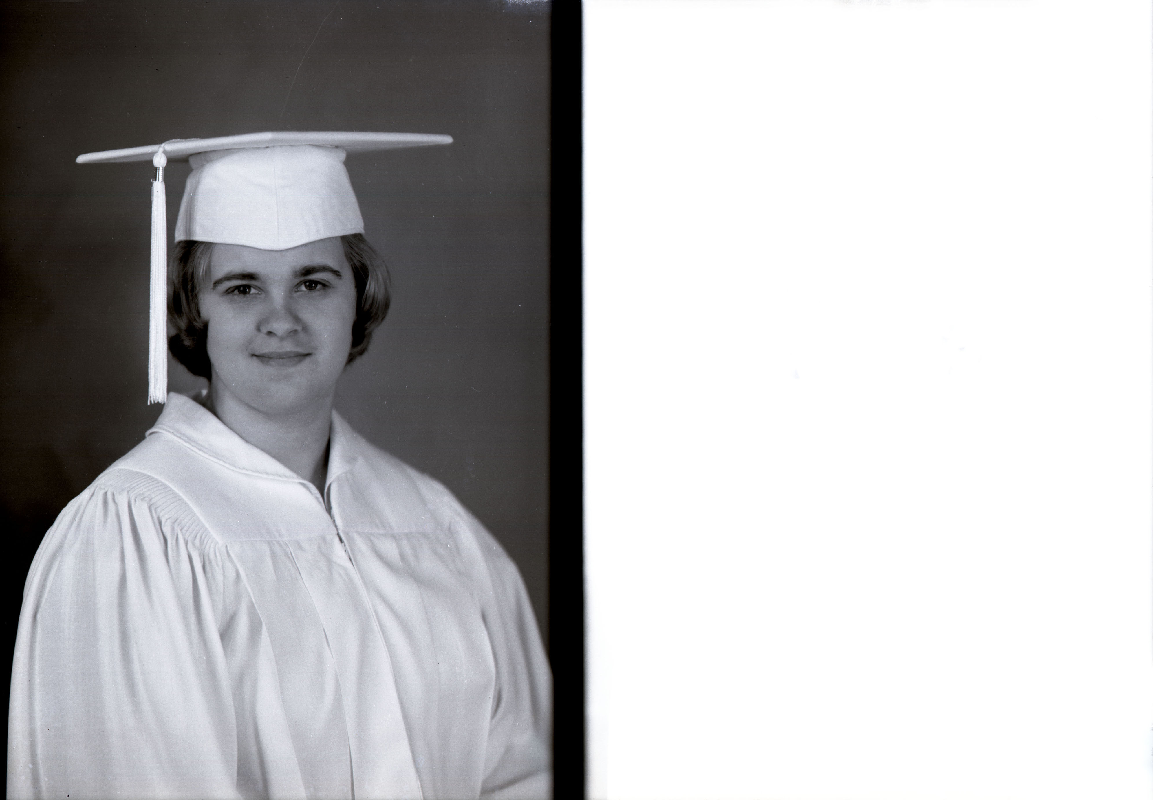 Portrait photograph of an unidentified young woman with short hair wearing a graduation cap and gown.