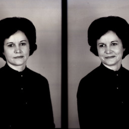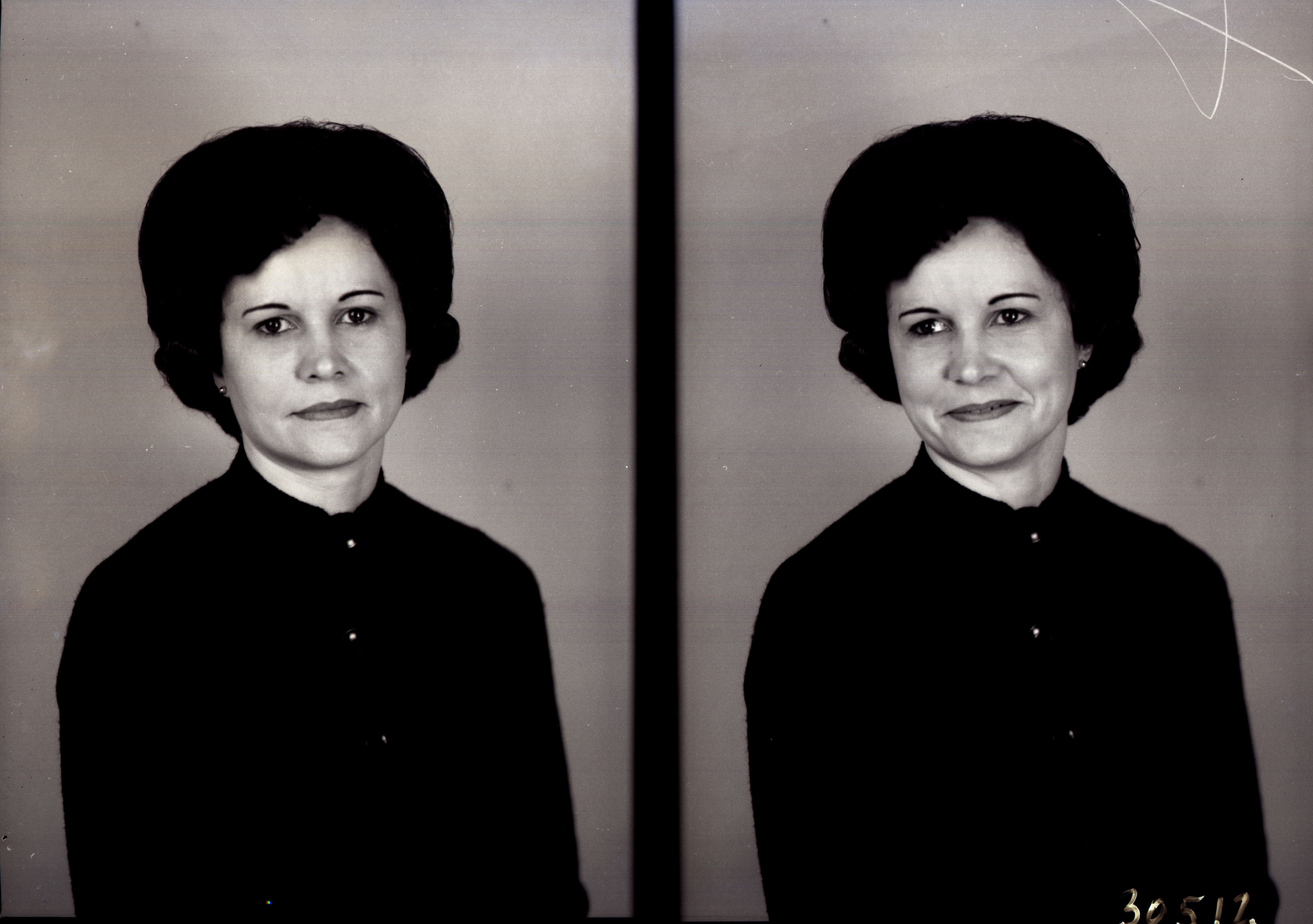 Photo of two separate portrait photographs of an unidentified woman with short, styled hair.