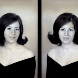 Photo of two separate portrait photographs of the same unidentified young woman with her hair curled outwards.