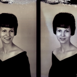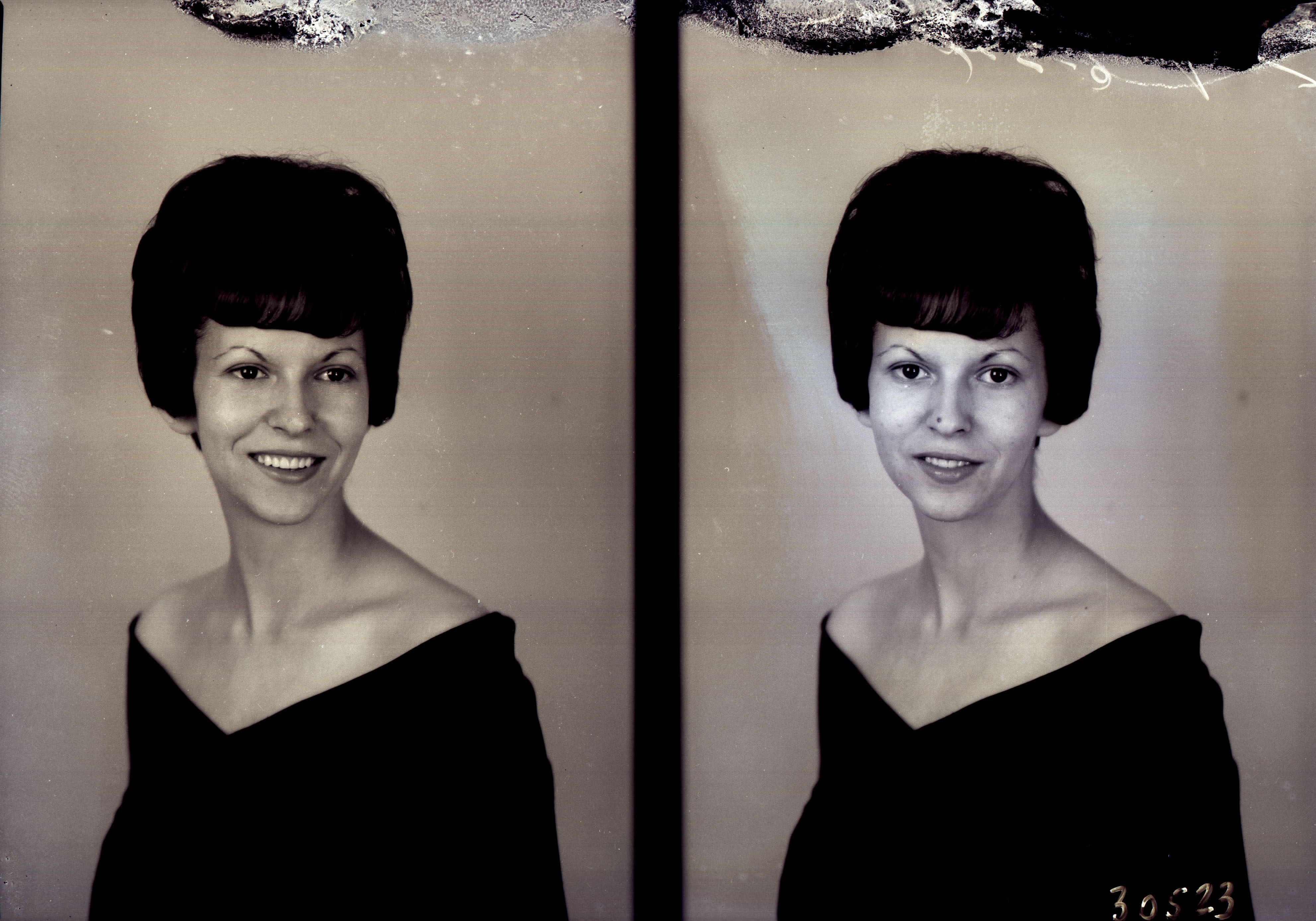 Photo of two separate portrait photographs of the same unidentified young woman with short hair and bangs.