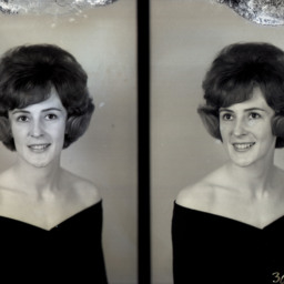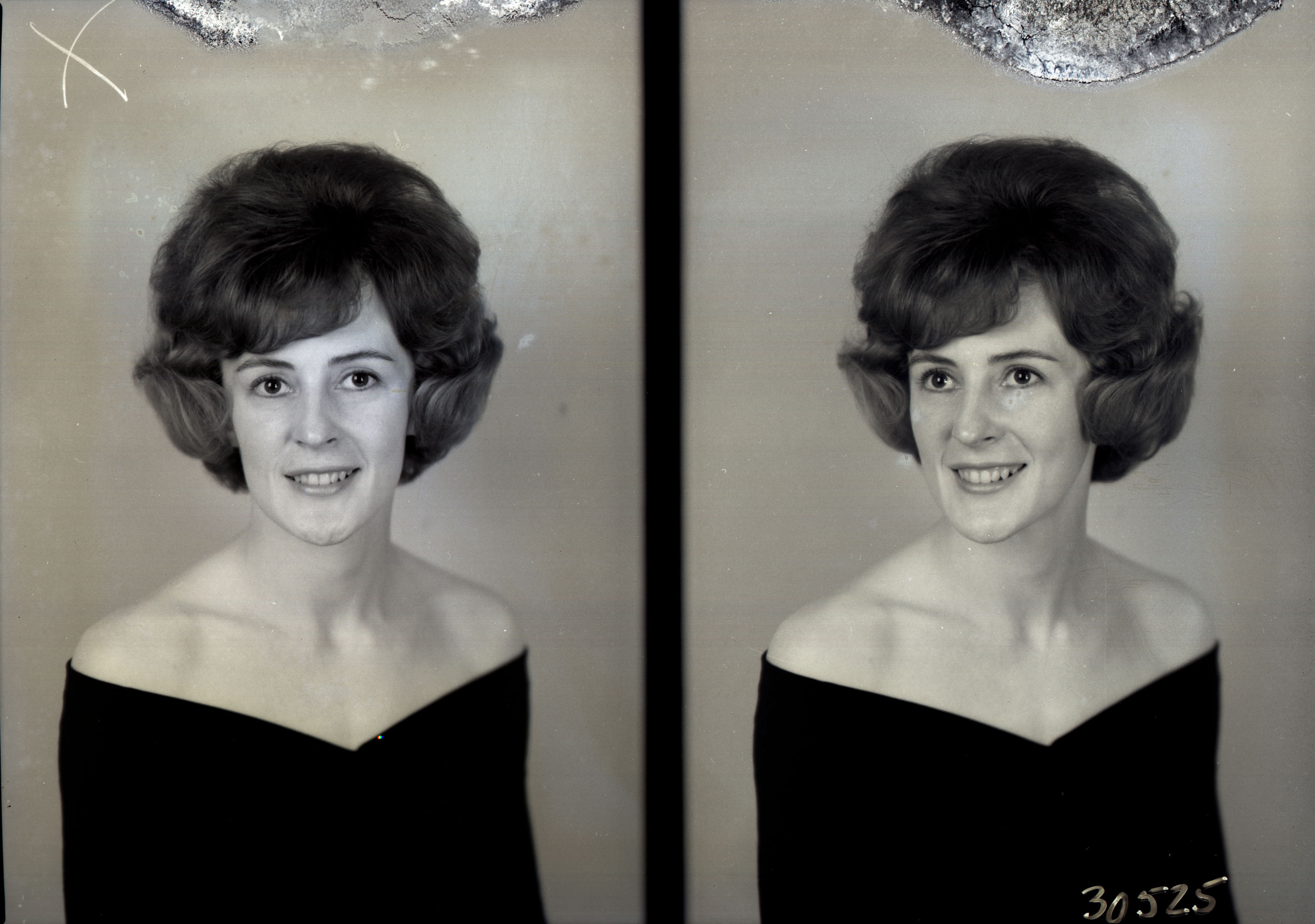 Photo of two separate portrait photographs of the same unidentified young woman with styled hair.