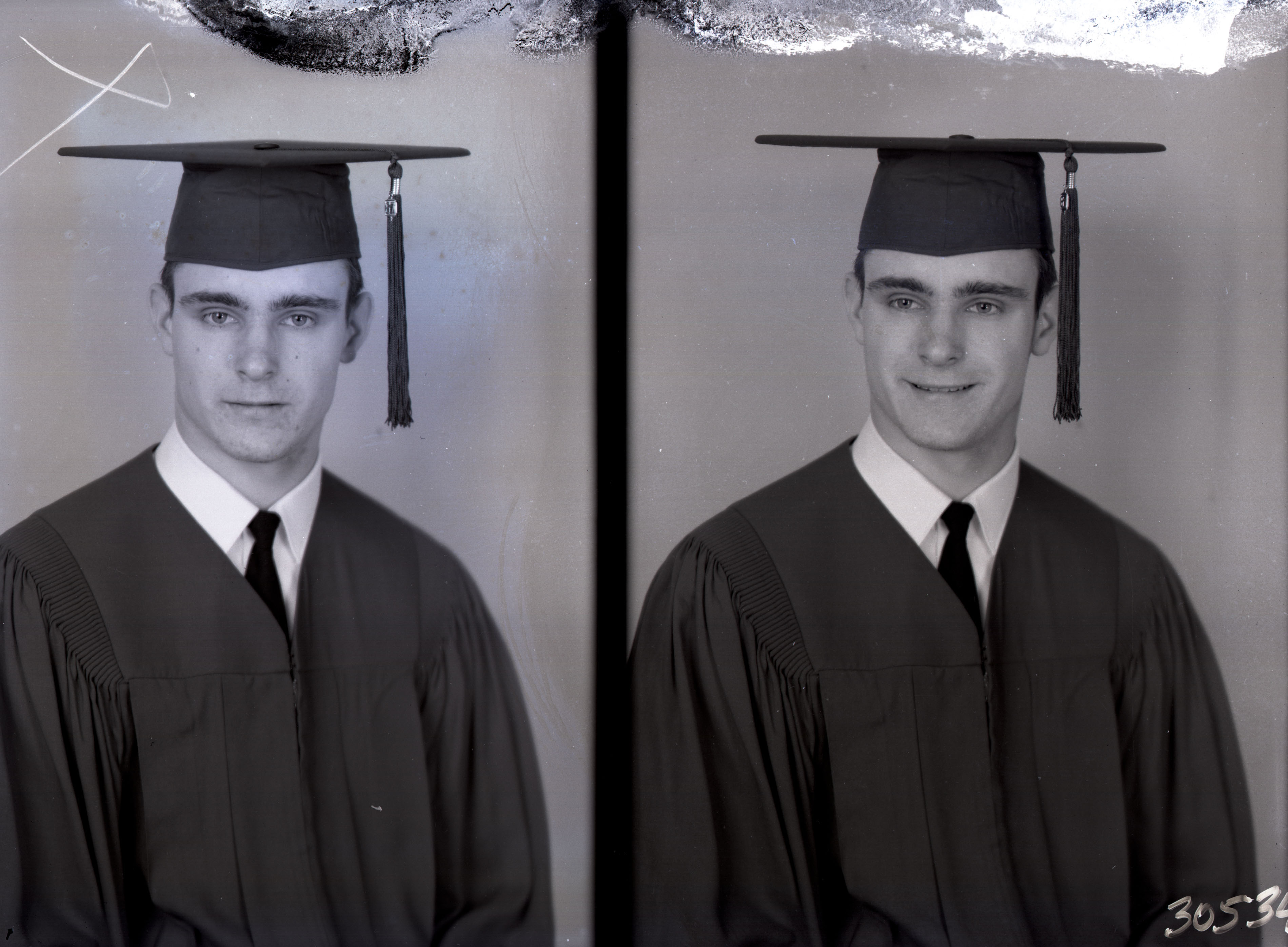 Photo of two separate portrait photographs of Gary Joe Wakeman in his graduation cap and gown.
