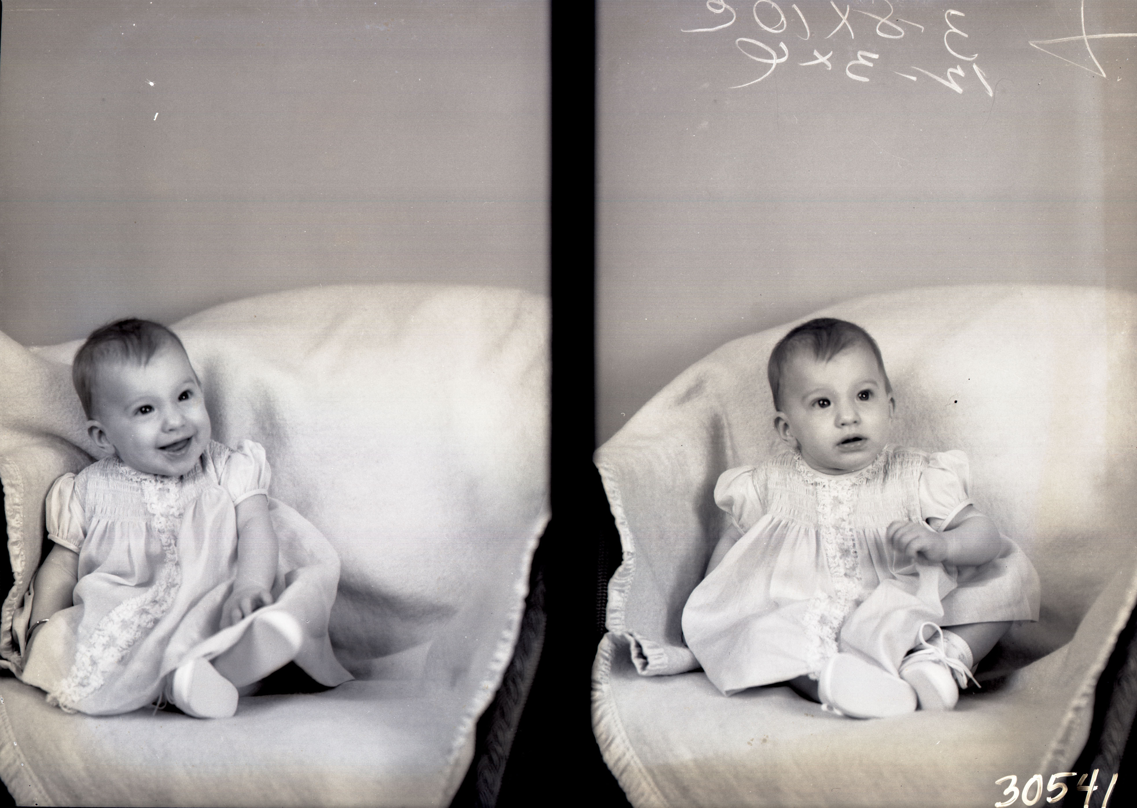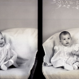 Photo of two separate photograph of the same unidentified young child seated on a covered chair.