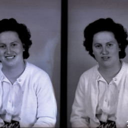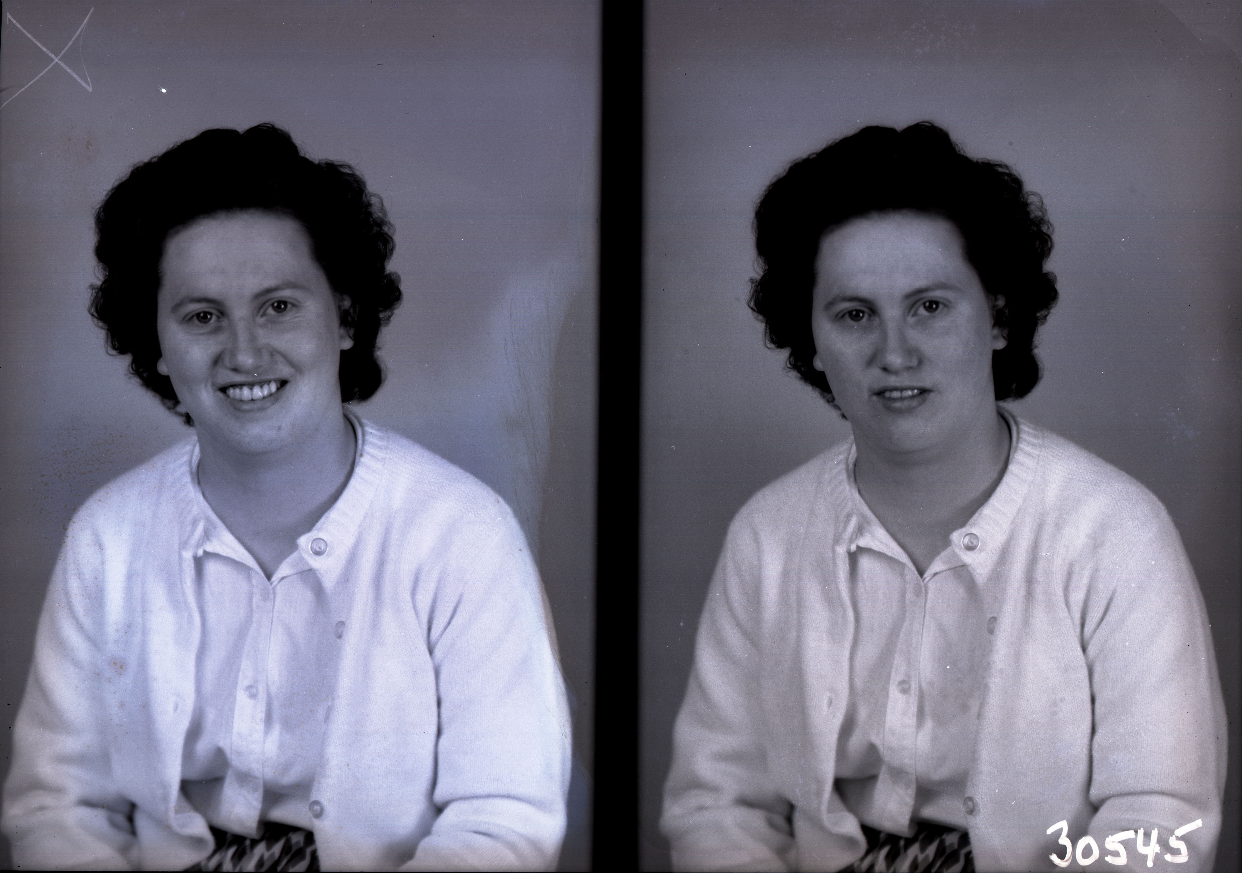 Photo of two separate portrait photographs of the same unidentified woman with short hair and wearing a cardigan sweater over her blouse.