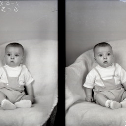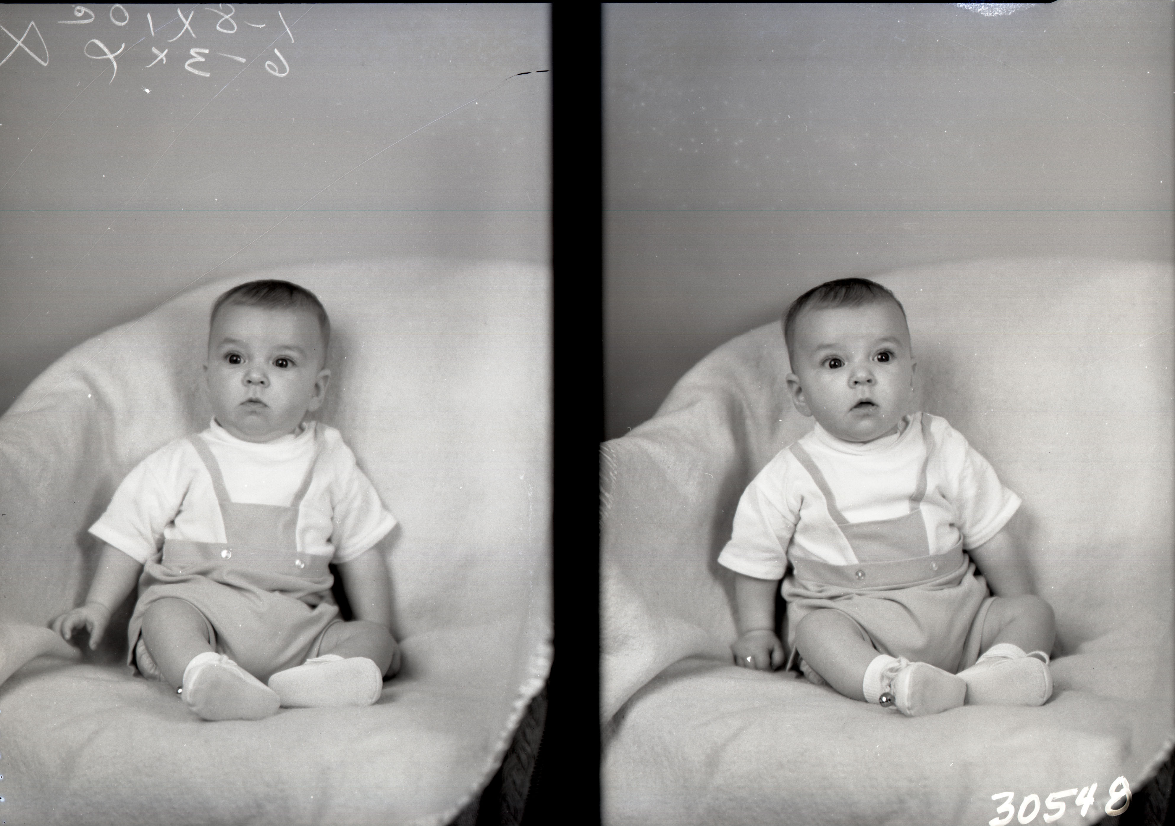 Photo of two separate photographs of the same unidentified young child posed on a covered surface.
