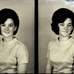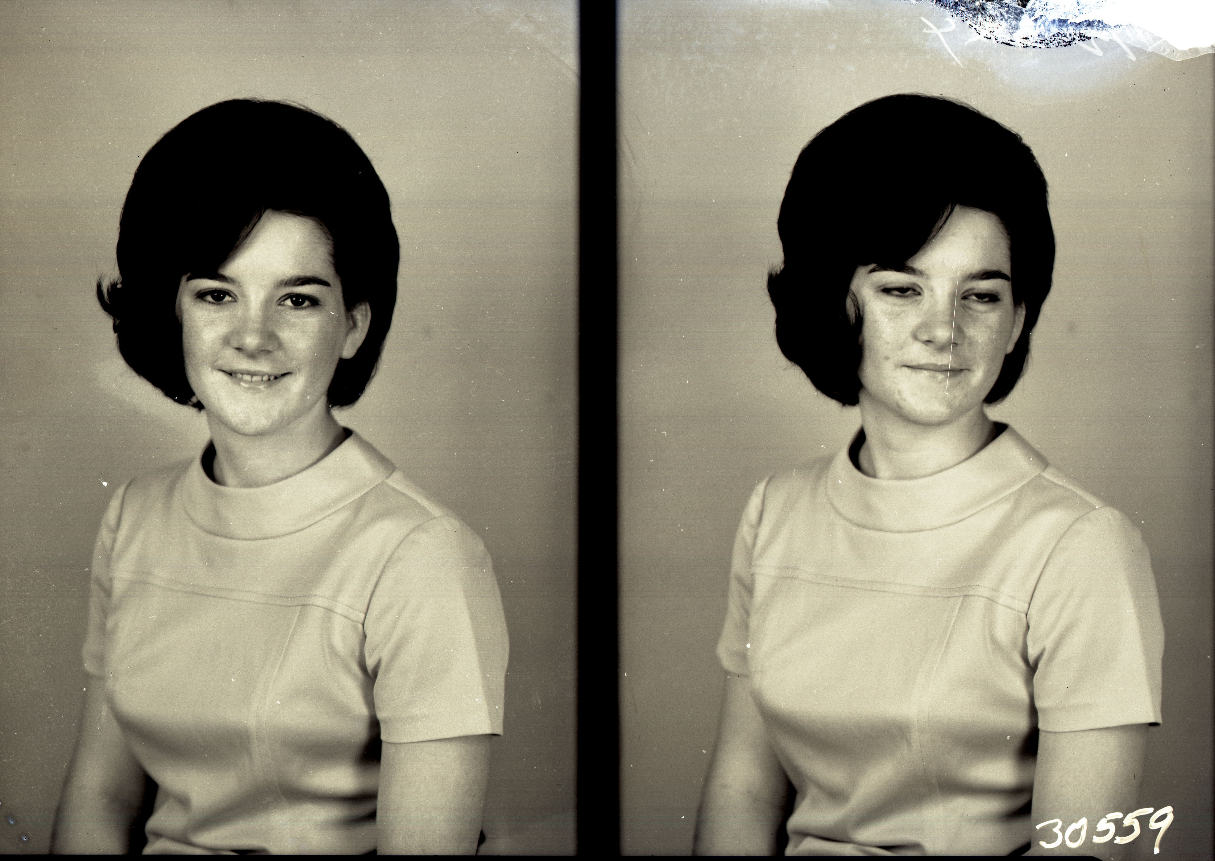 Photo of two separate portrait photographs of the same unidentified woman with short, dark hair and wearing a short-sleeved dress.