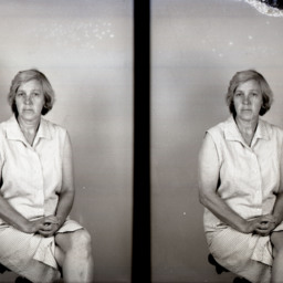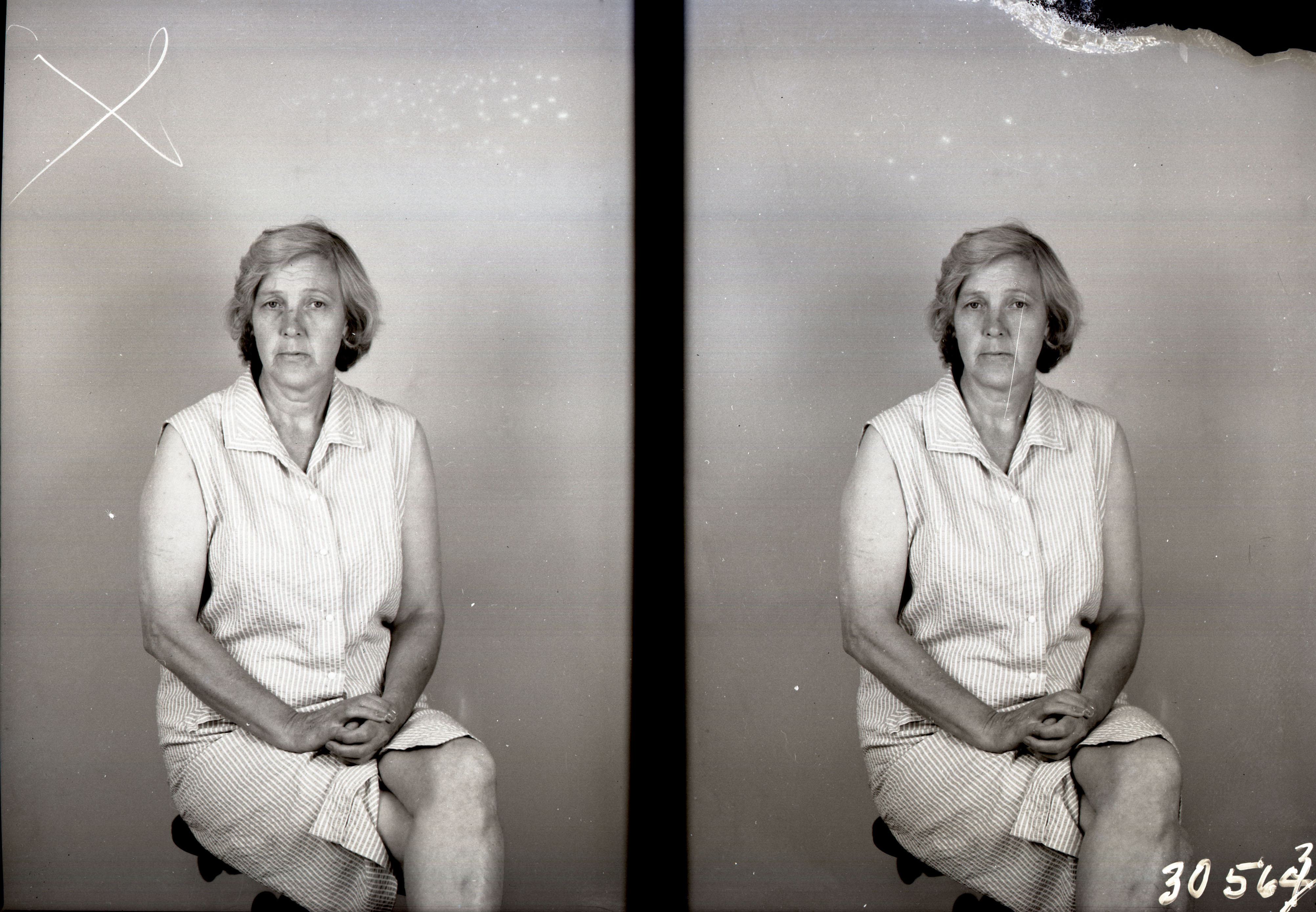 Photo of two separate photographs of the same unidentified woman with short hair and wearing a striped, sleeveless dress.