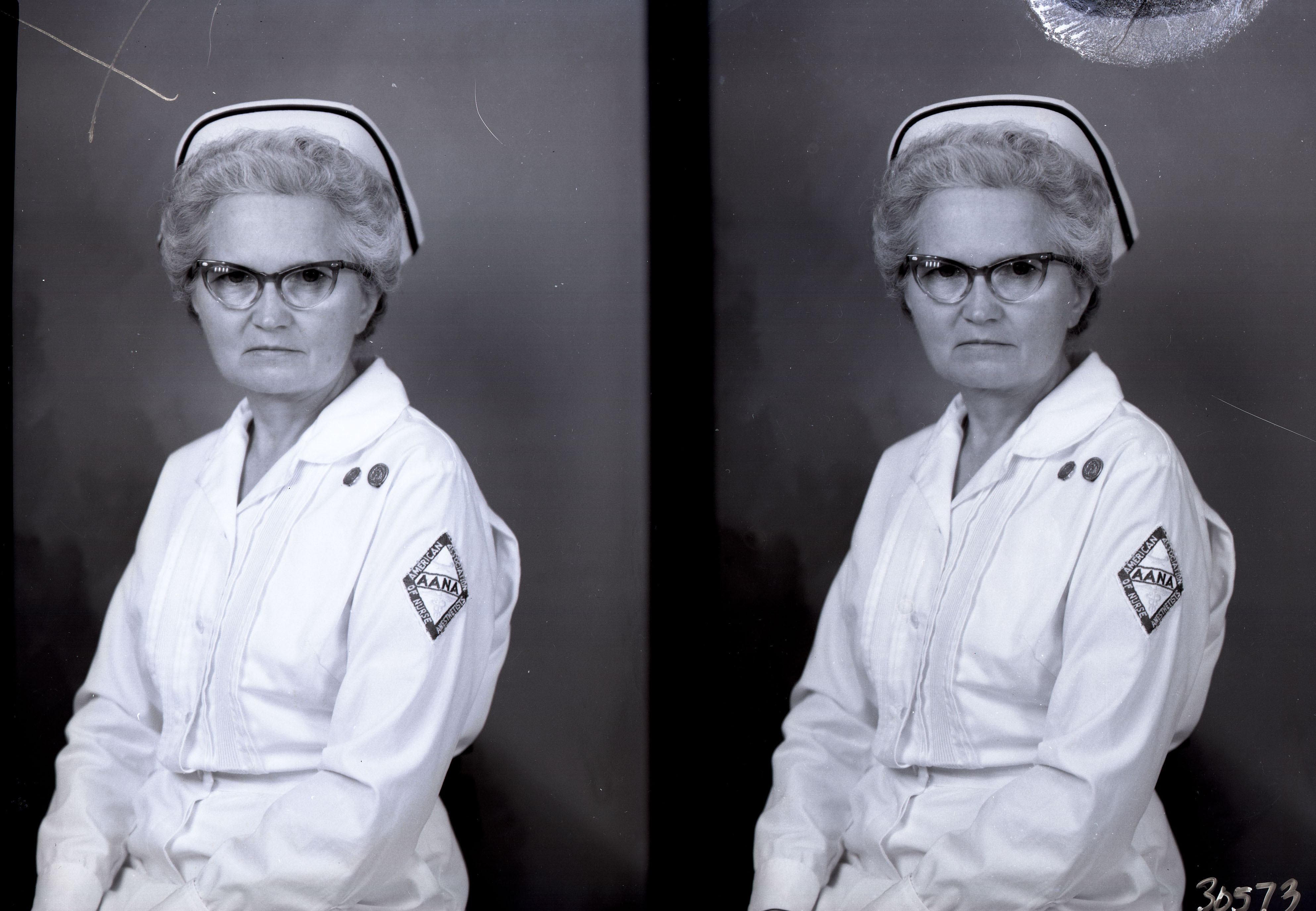 Photo of two separate photographs of an unidentified nurse in uniform. The patch on her shoulder reads, "American Association of Nurse Anesthetists".