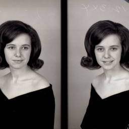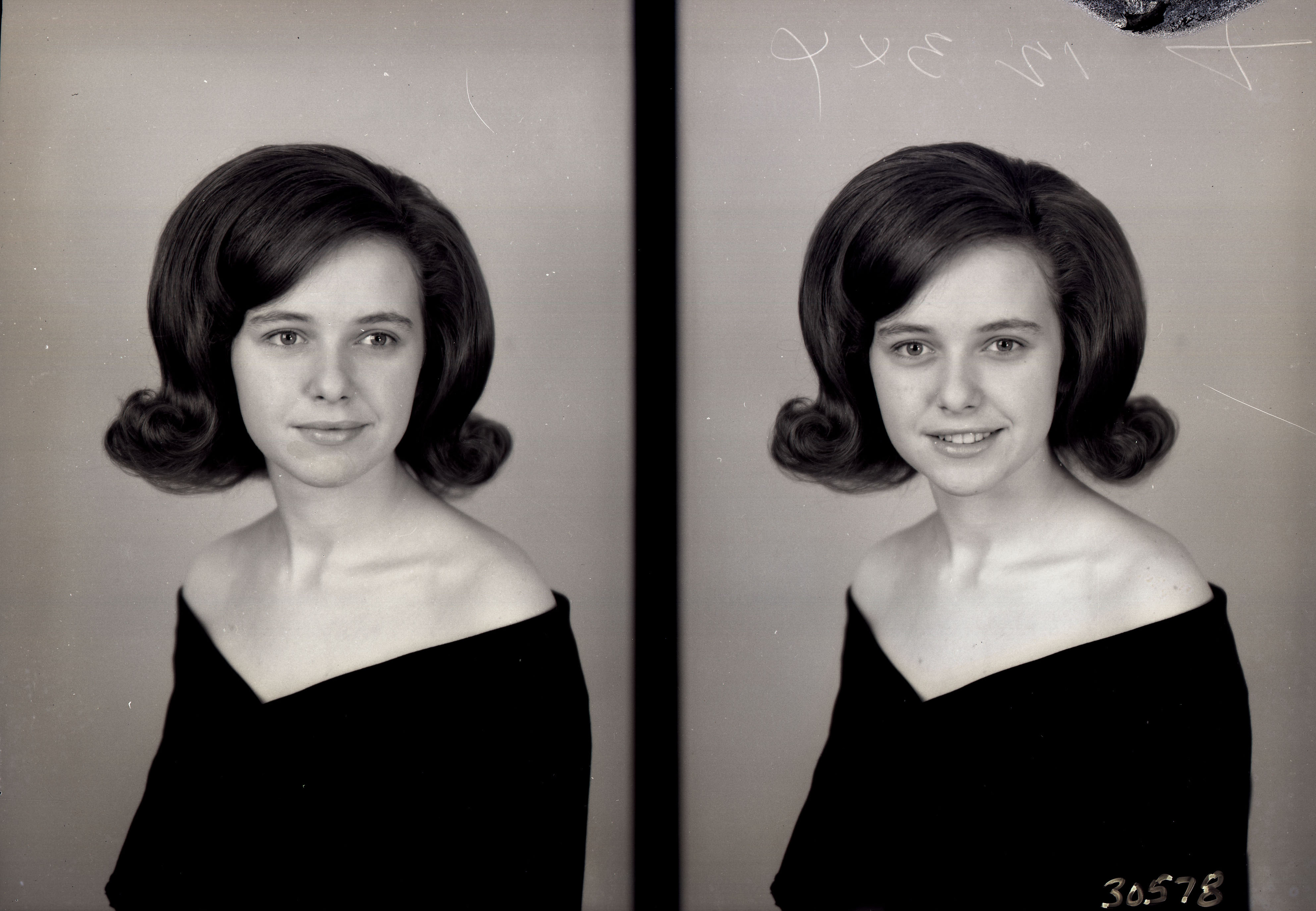 Photo of two separate portrait photographs of the same unidentified young woman with short, styled hair curled outwards.