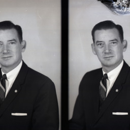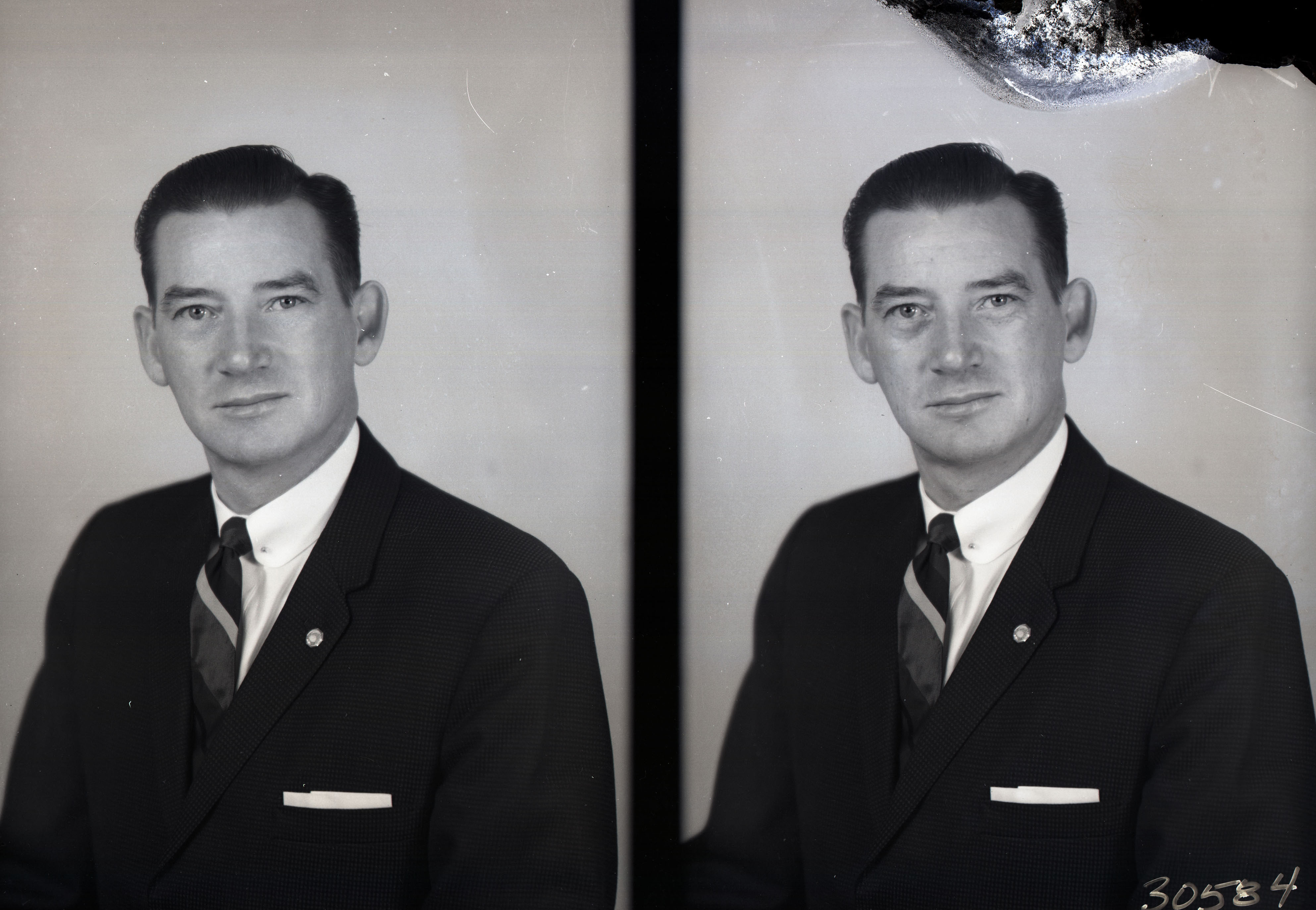 Photo of two separate portrait photographs of the same unidentified man wearing a suit and striped tie with a pin on his lapel. His handkerchief is sticking out of his breast pocket.