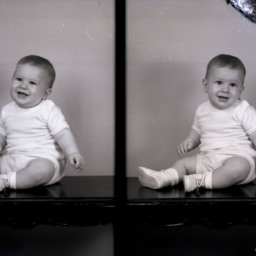 Photo of two separate photographs of an unidentified young child seated on a bench.