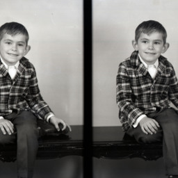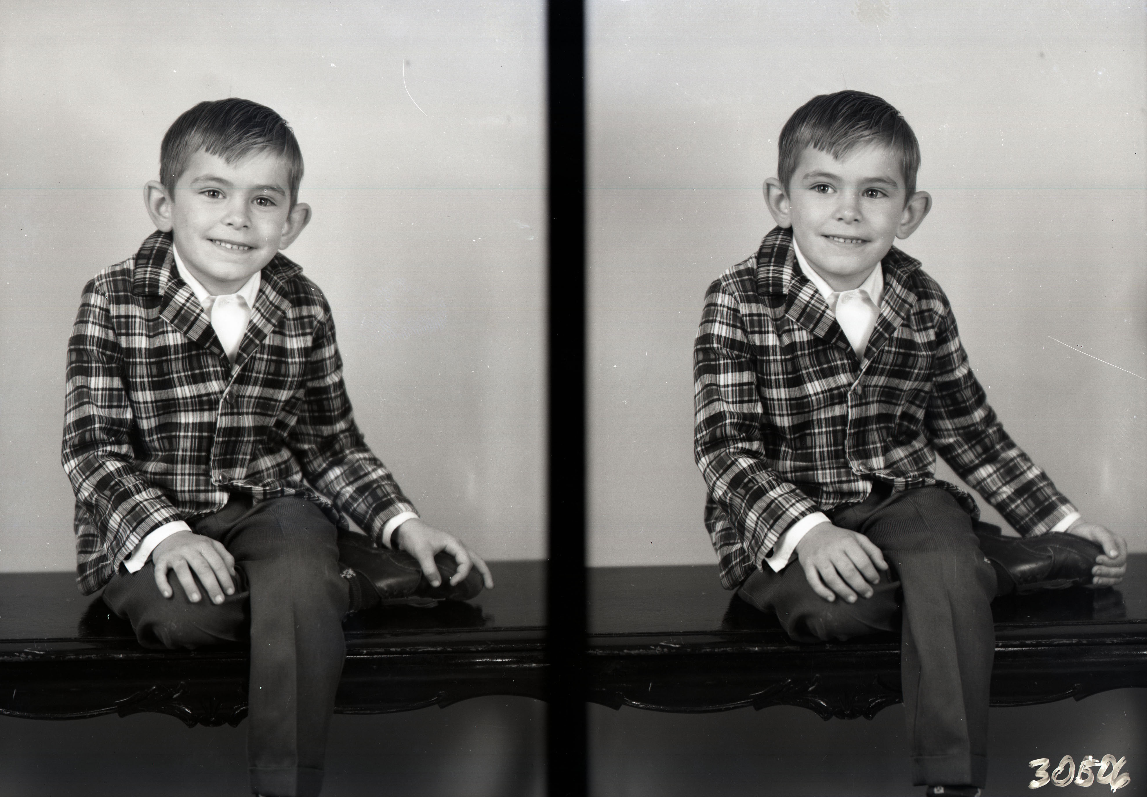 Photo of two separate photographs of the same unidentified boy in a plaid jacket and seated with one leg under the other.