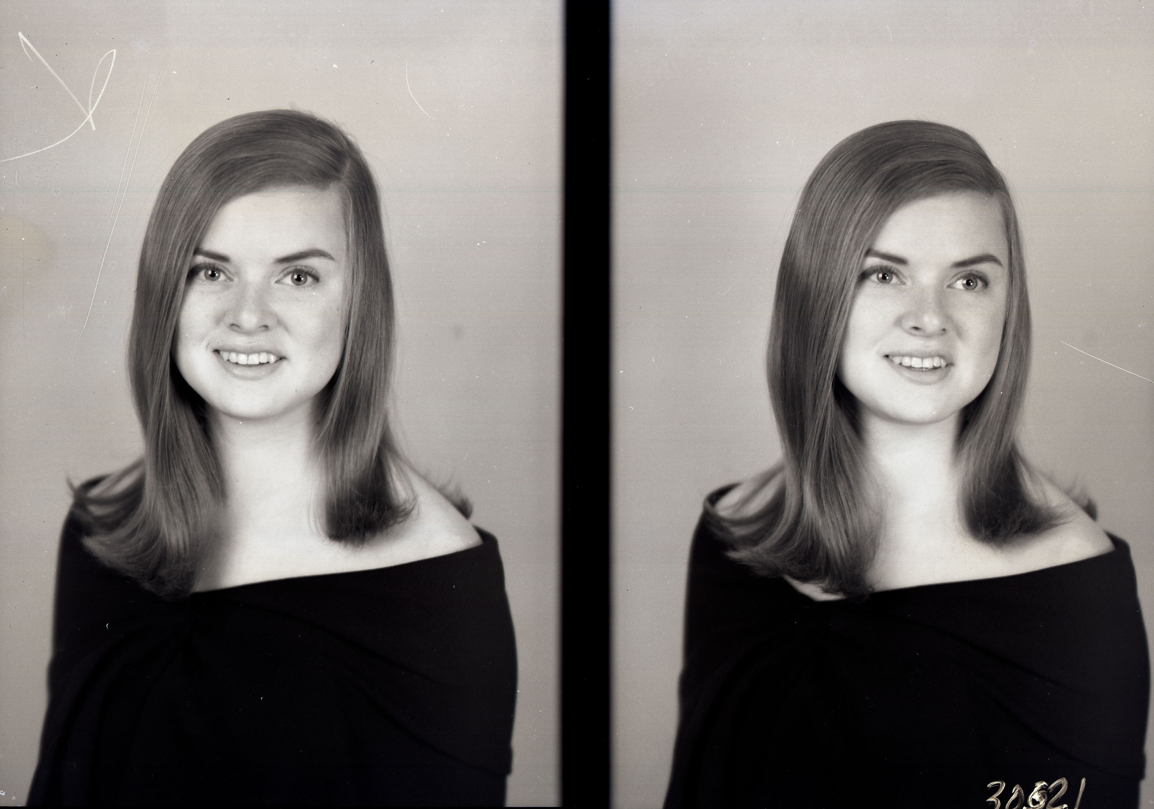 Photo of two separate portrait photographs of Sandra Kay (Wolverton) White as a young woman with shoulder-length, straight hair.