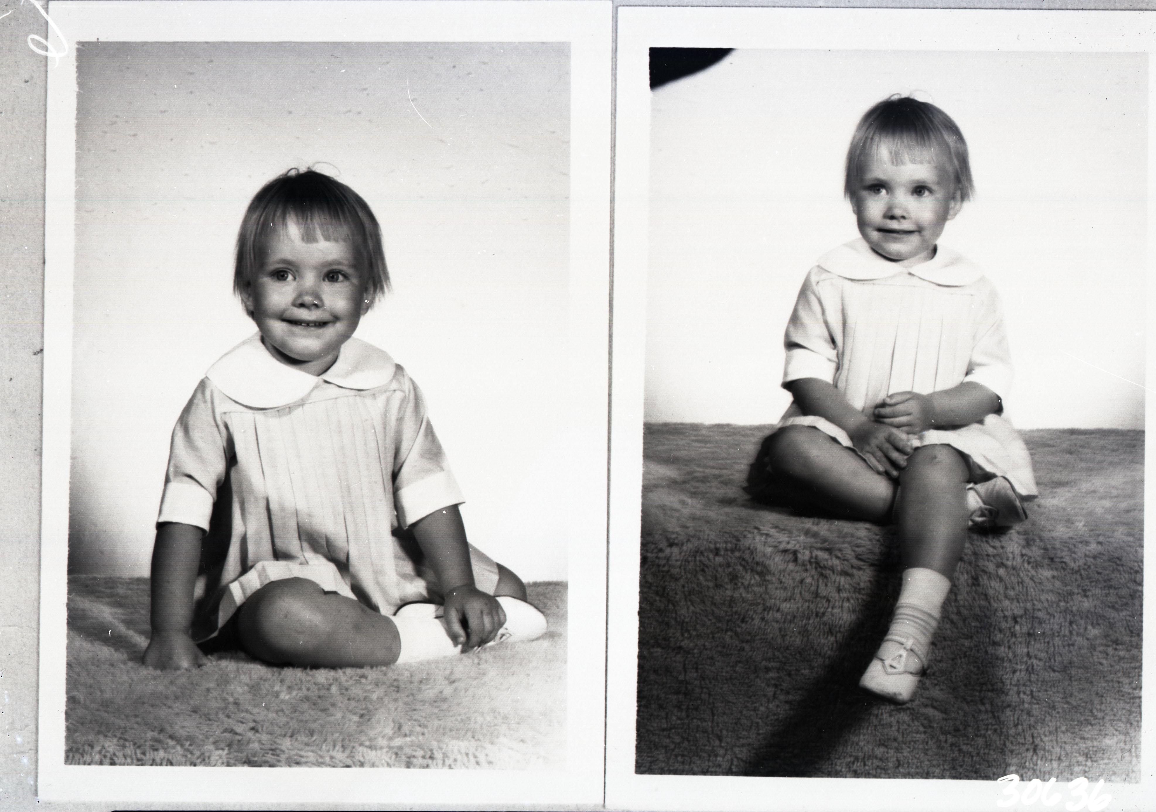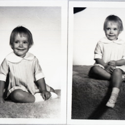Photo of two separate photographs of the same unidentified young girl with short hair and bangs.