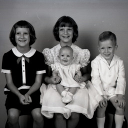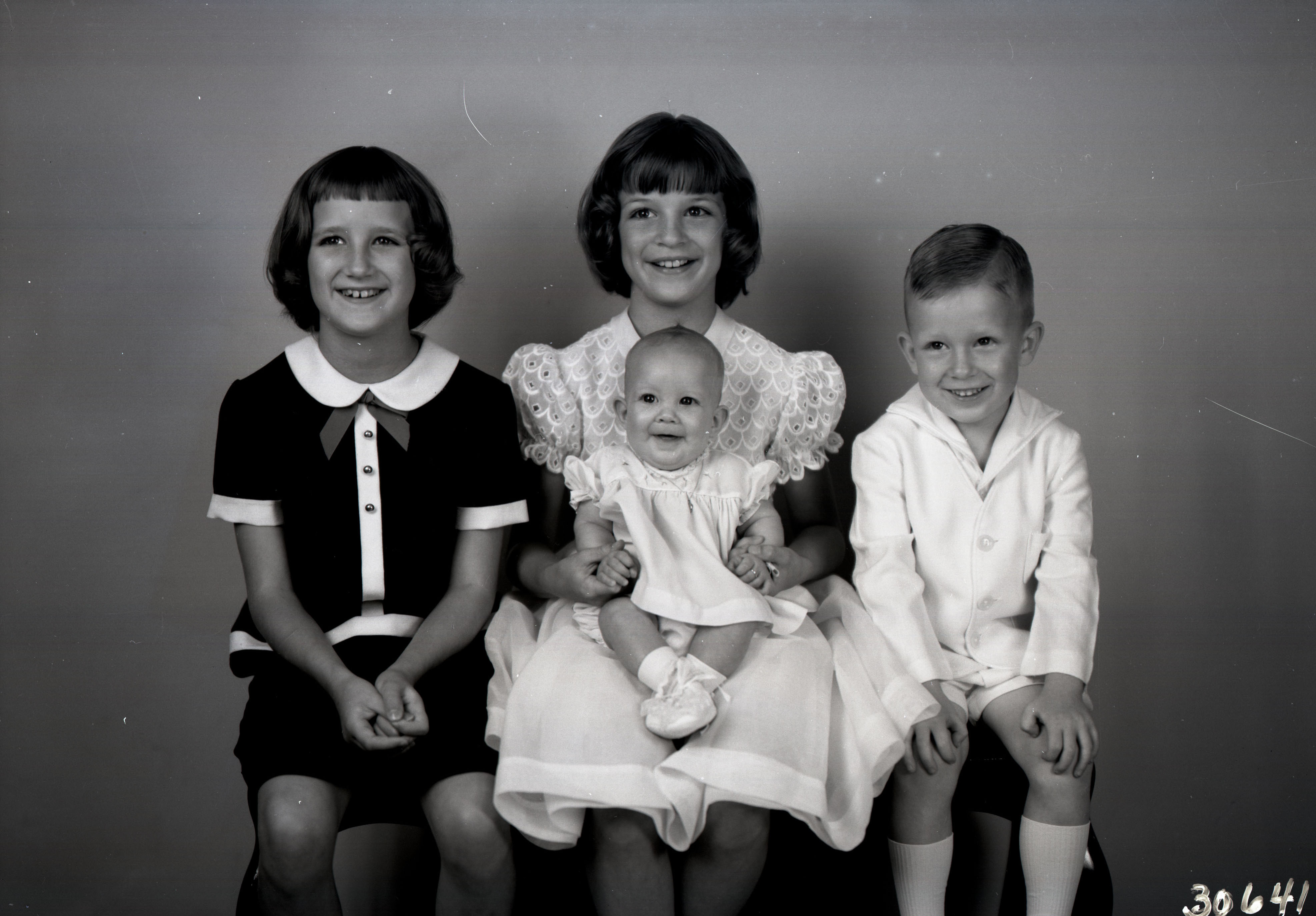 Four unidentified children of varying ages, two girls with short hair and bangs, a younger boy, and a baby, are posed together.
