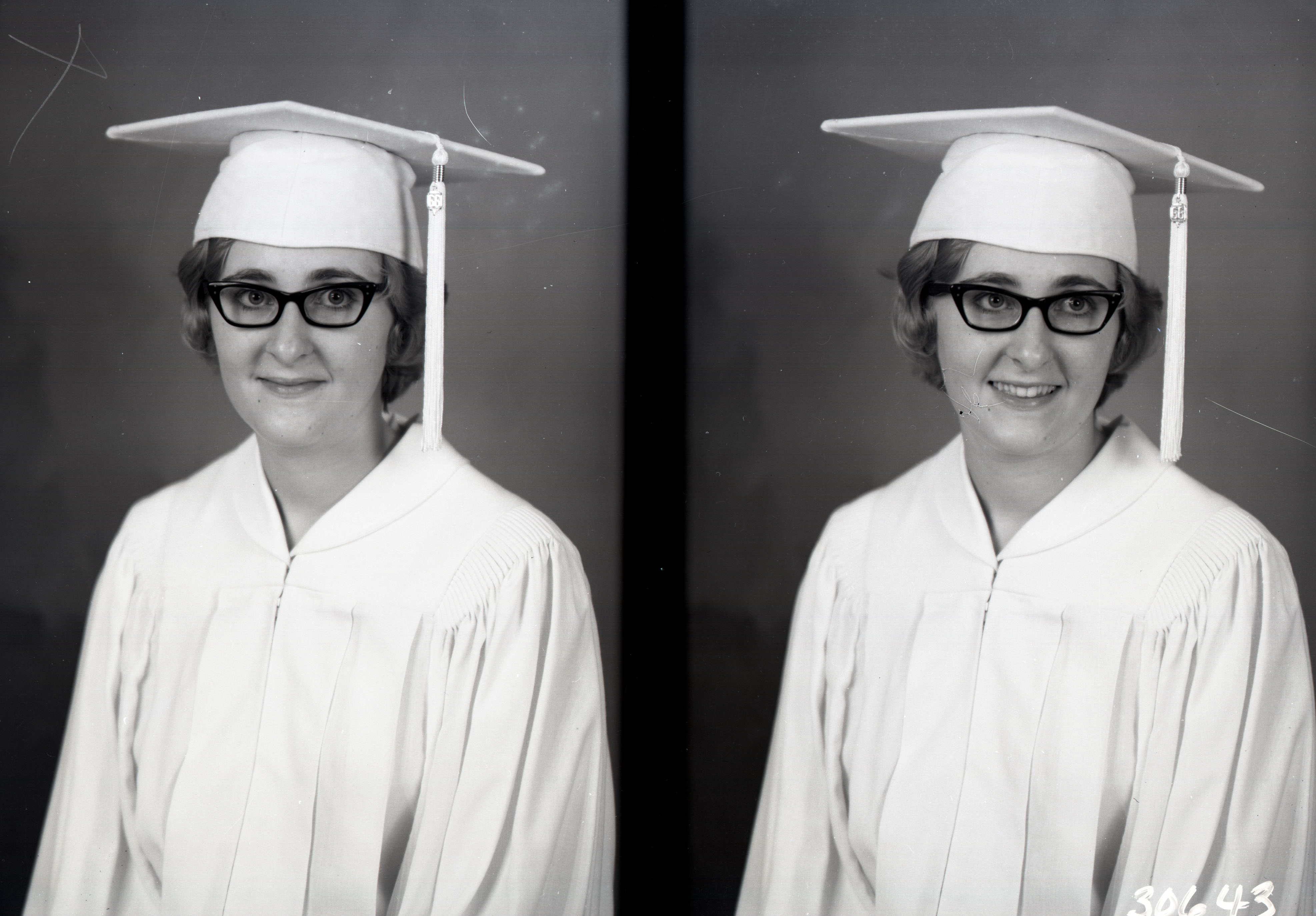 Photo of two separate portrait photographs of the same unidentified young woman with glasses and wearing a graduation cap and gown.