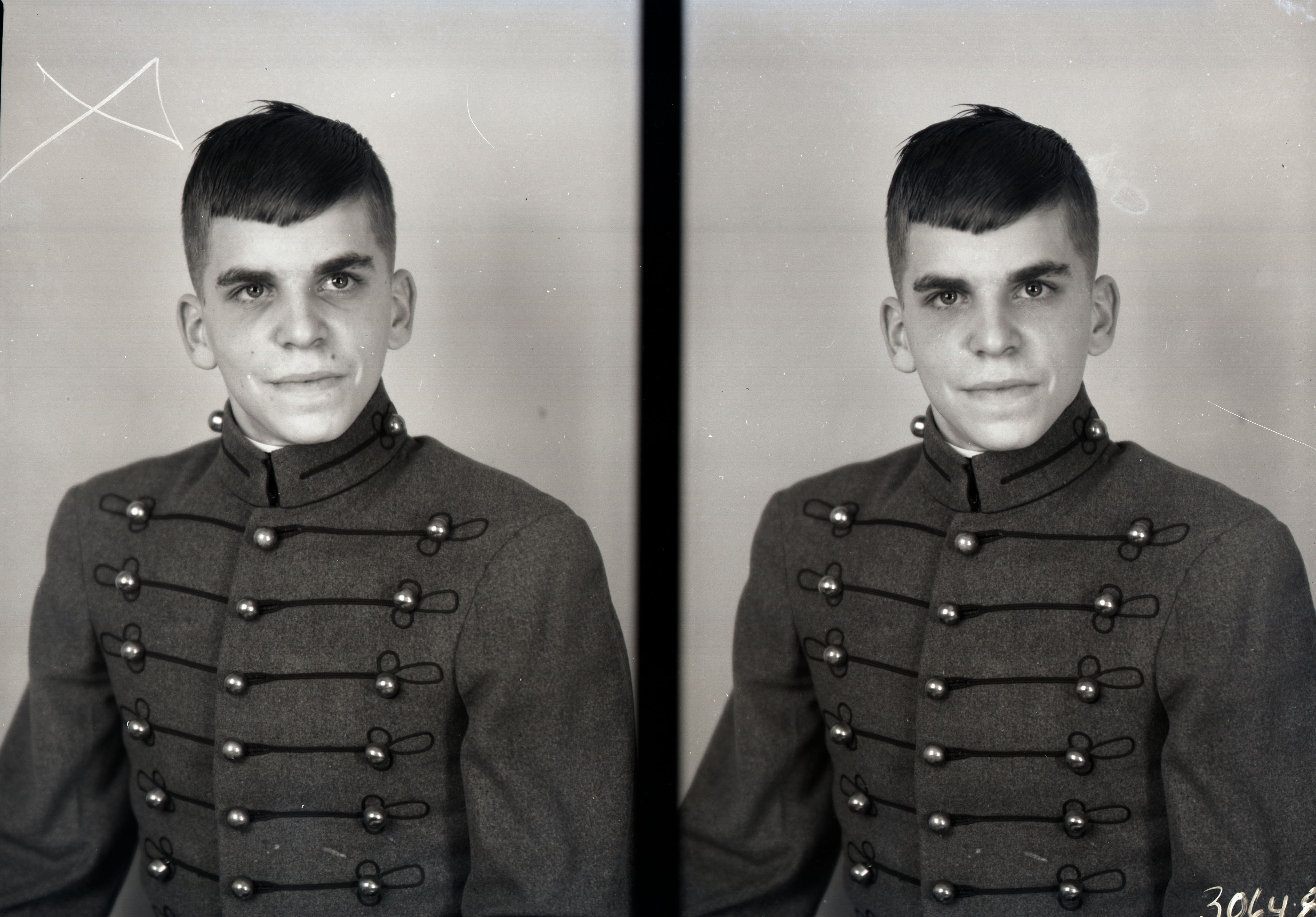 Photo of two separate portrait photographs of the same unidentified cadet from Massanutten Military Academy (MMA) wearing his school's uniform.