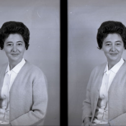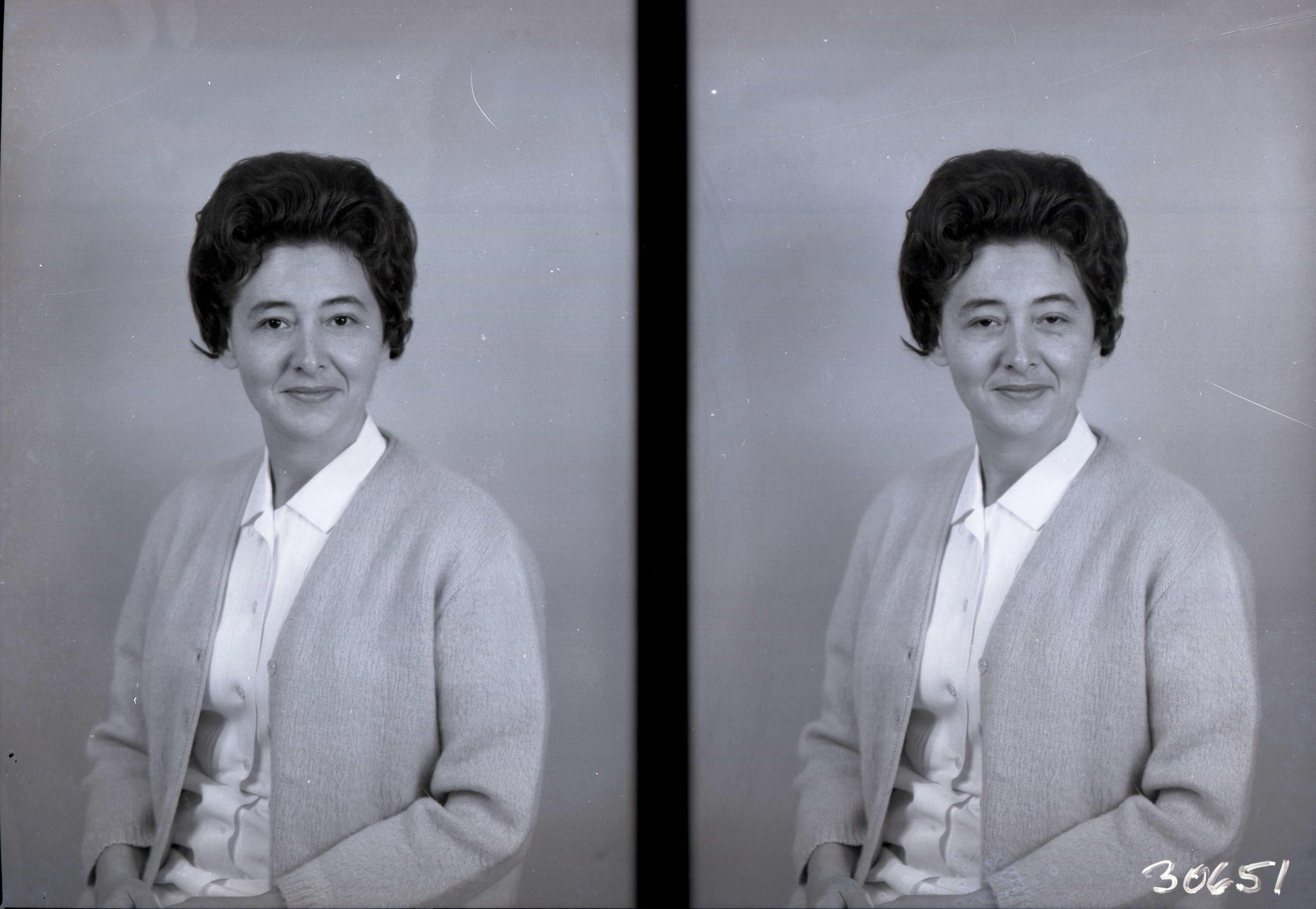 Photo of two separate portrait photographs of the same unidentified woman with short styled hair and wearing a jacket over a blouse.