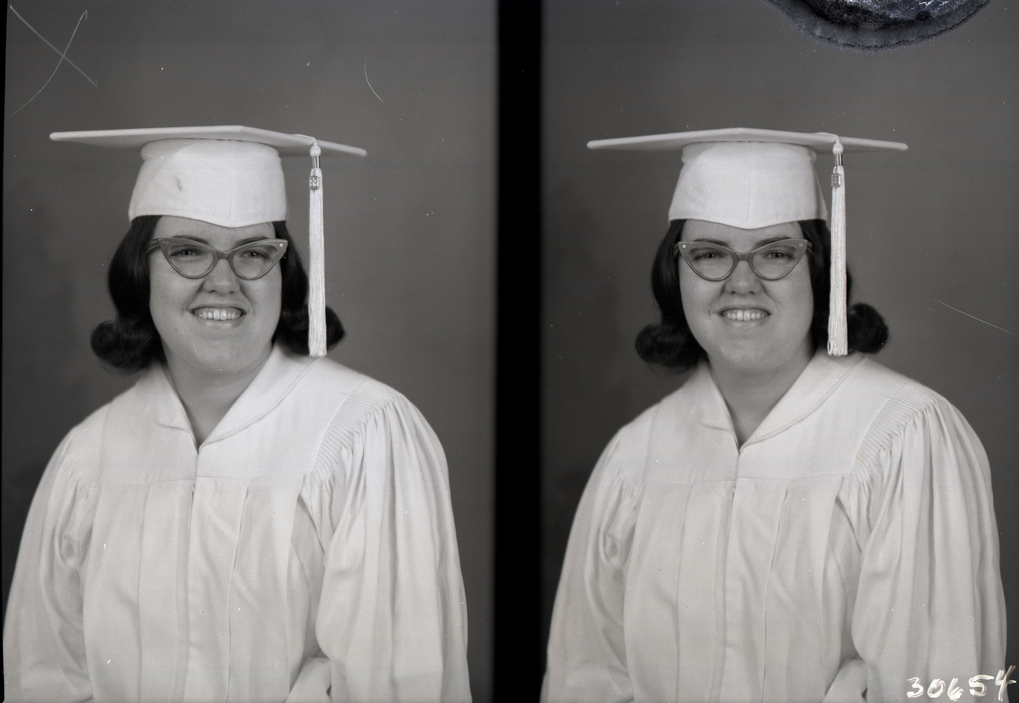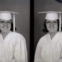 Photo of two separate photographs of the same unidentified woman with glasses and wearing a graduation cap and gown.