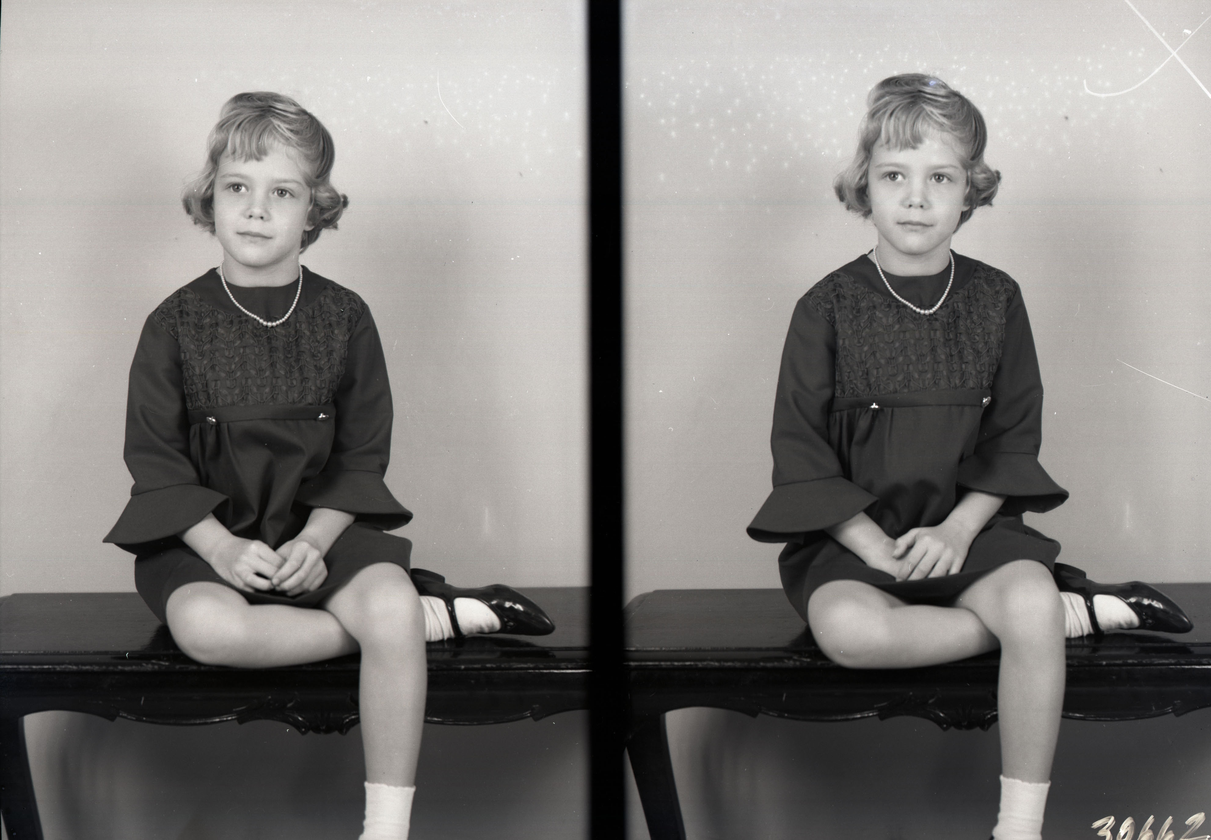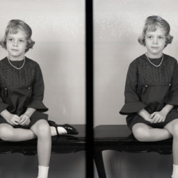 Photo of two separate photographs of the same unidentified girl with short hair and bangs seated on a bench with one leg under the other.