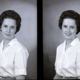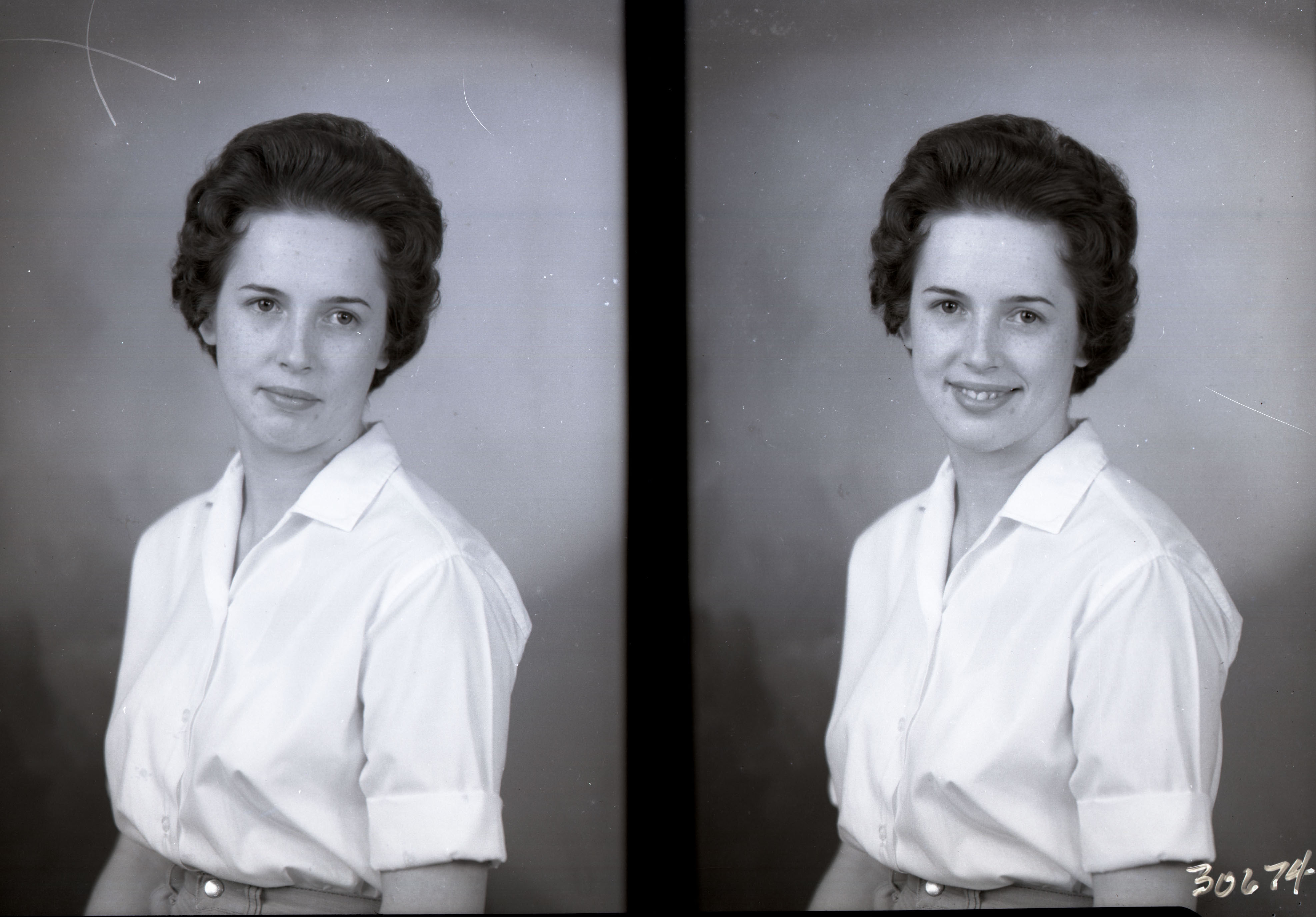 Photo of two separate portrait photographs of the same unidentified woman with short styled hair and wearing a short-sleeved blouse and skirt.