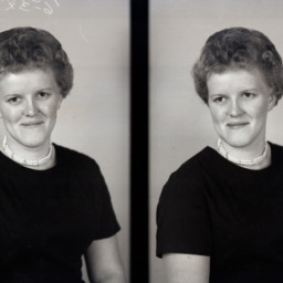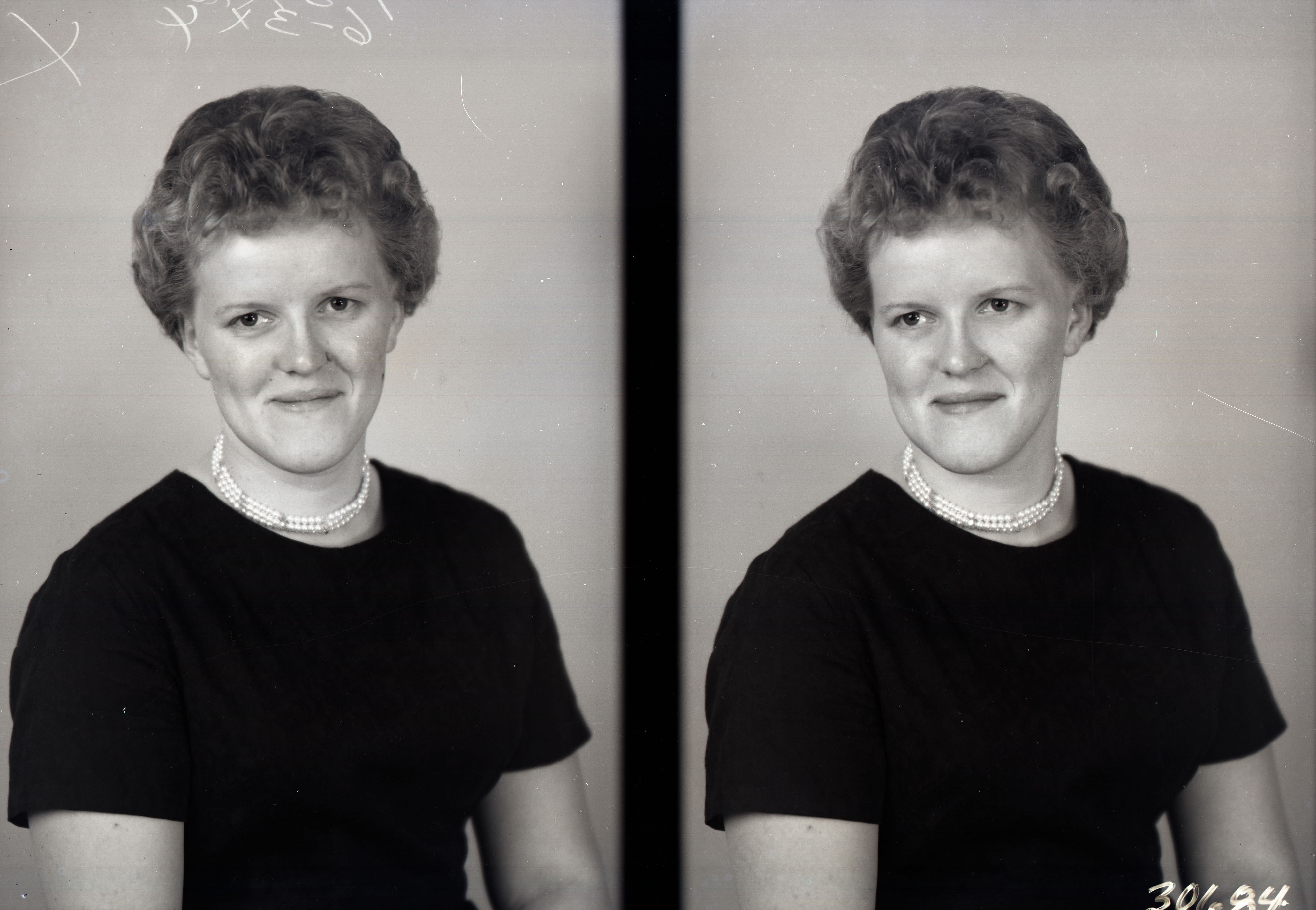 Photo of two separate portrait photographs of the same unidentified woman with short hair and wearing a necklace with her short-sleeved dress.
