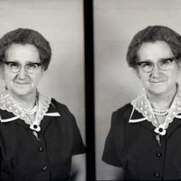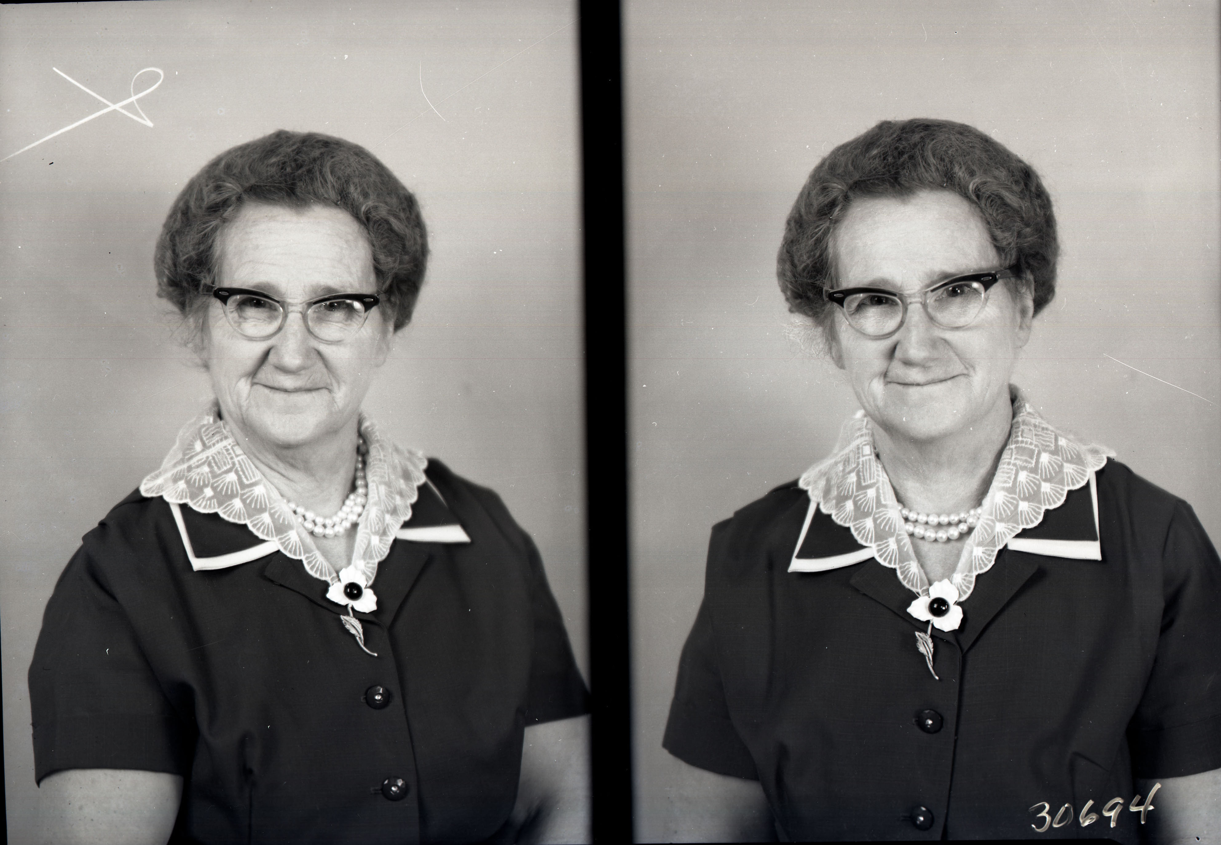 Photo of two separate portrait photographs of the same unidentified older woman with glasses, a necklace, and wearing a flower pin on the front of her dress.
