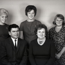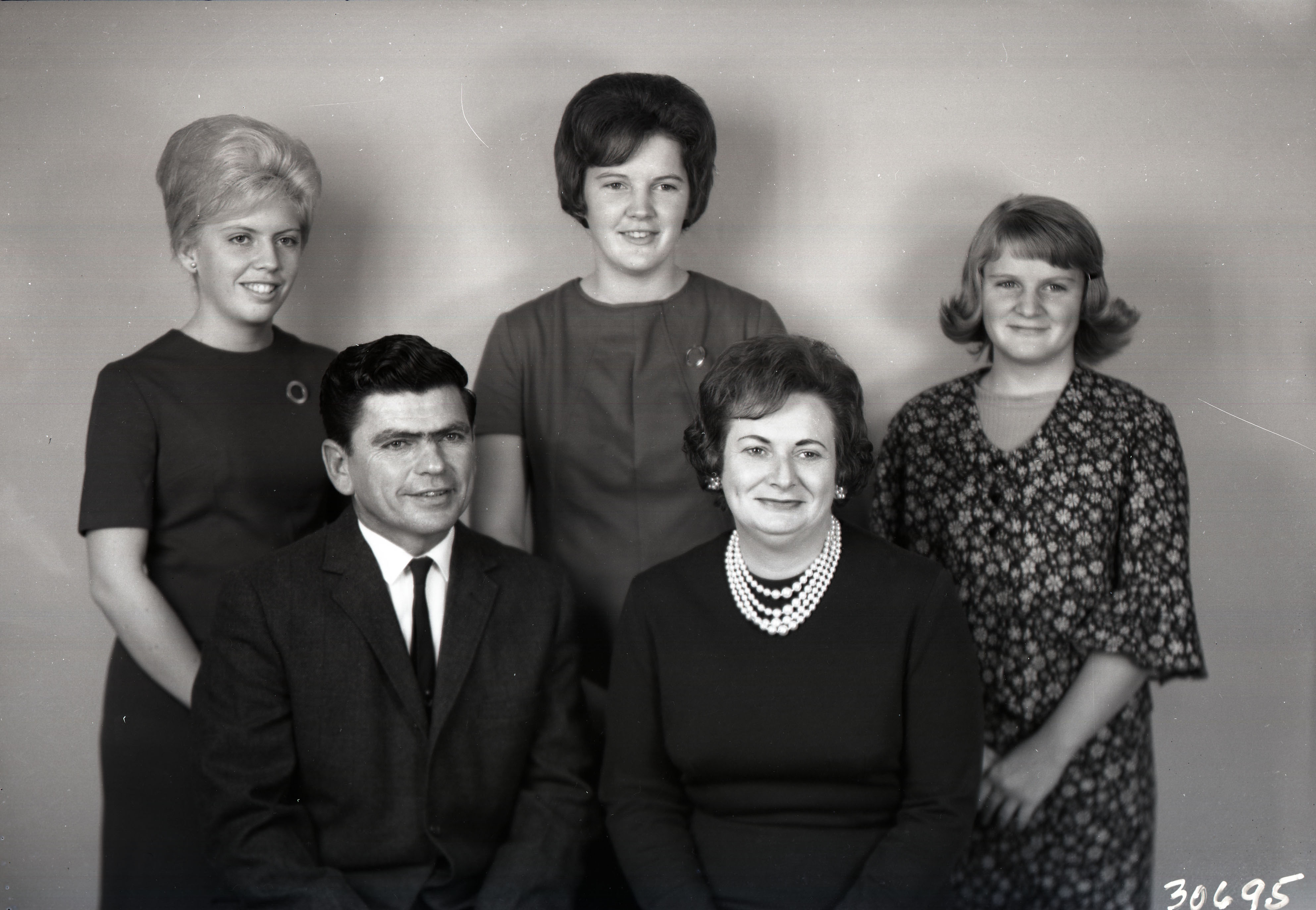 Unidentified man and woman are seated together with three unidentified young women of different ages standing behind them.